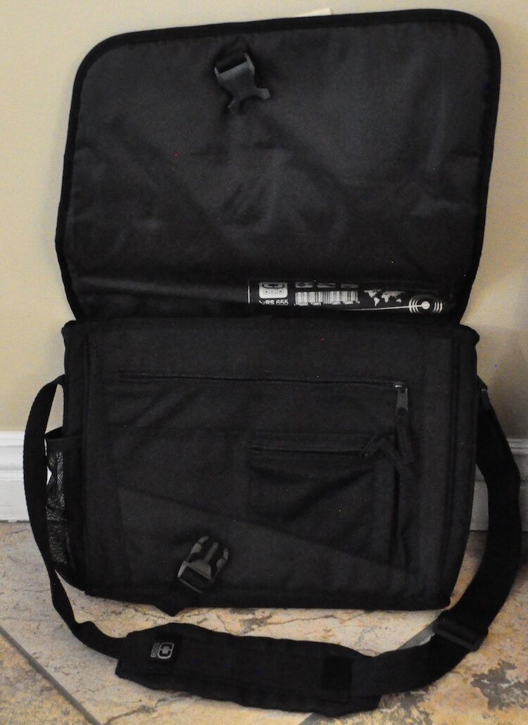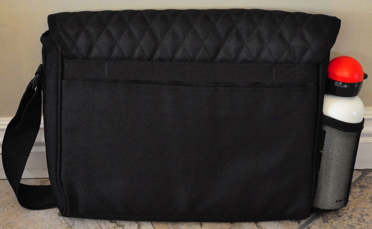 This brand-new computer bag holds a laptop up to 15 inches in length, and it also has a compartment for a water bottle on the outside.