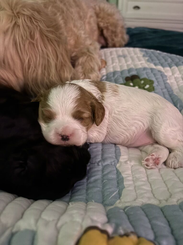 These adorable 3-week old mini puppies are a beautiful mix of King Charles Cavalier and Poodle, inheriting the best traits from both breeds. They are known for their gentle, affectionate personalities making them the perfect additions to any family. Their hypoallergenic coats make them a great choice for allergy sufferers, and their playful, intelligent nature ensures endless entertainment. Cavapoos are adaptable to various lifestyles, thriving in both active and relaxed environments.