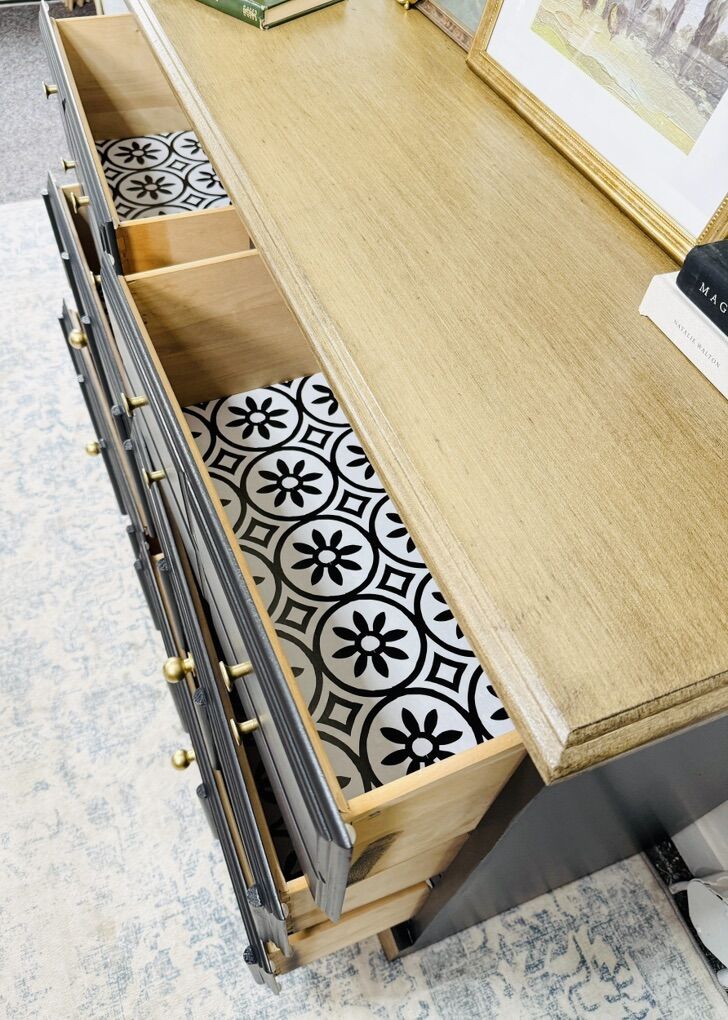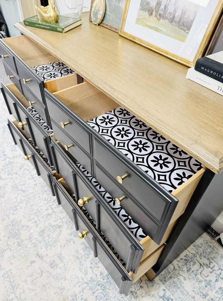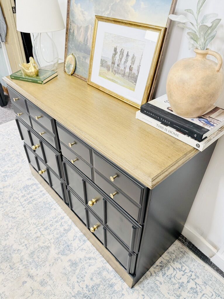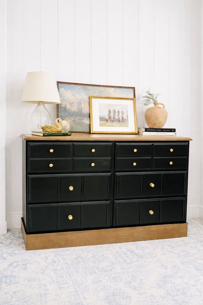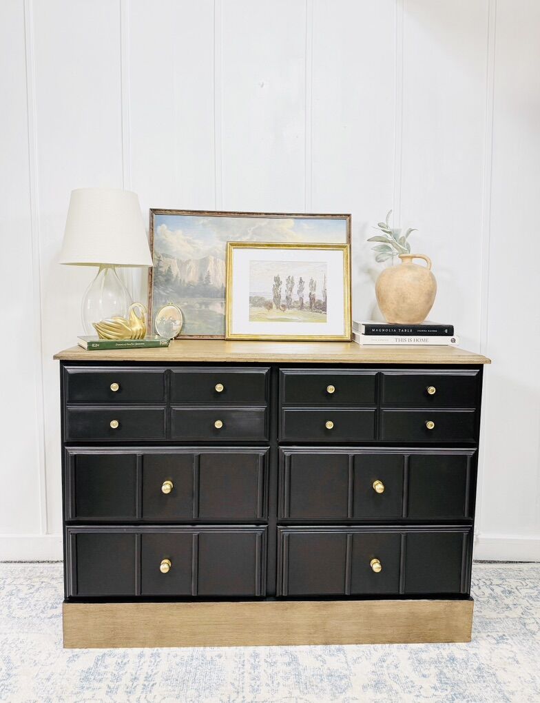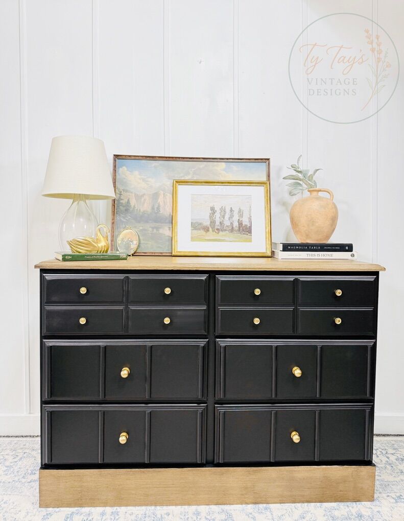 VenmoThis stunning dresser has been professionally refinished to bring a timeless yet modern feel to your home. The rich satin black body is paired beautifully with a warm, faux wood stained top and base, creating a perfect balance of elegance & style.