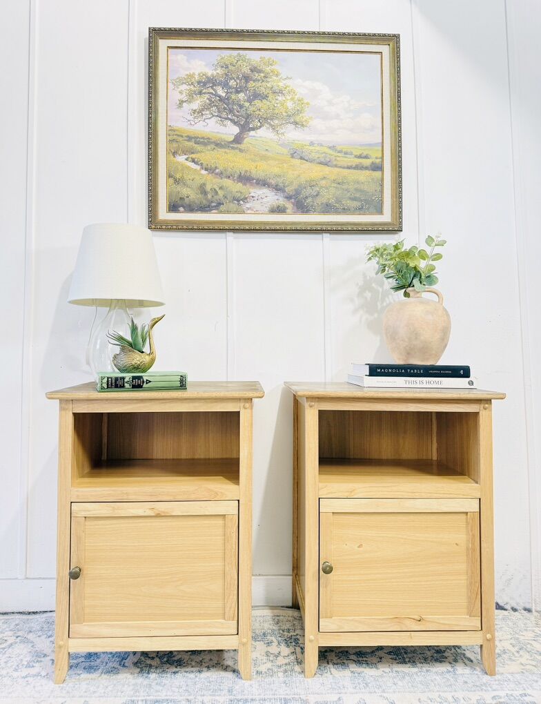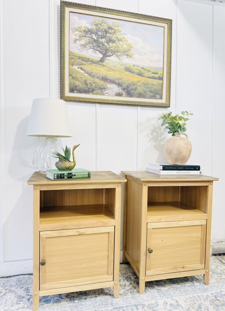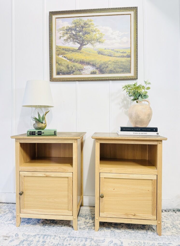 VenmoThis beautiful matching set of modern nightstands is the perfect blend of clean lines, warm natural tones, and everyday functionality. Purchased from a local furniture store just about a year ago and lightly used in our living room, these have been very well cared for and remain in great condition with no major dents.