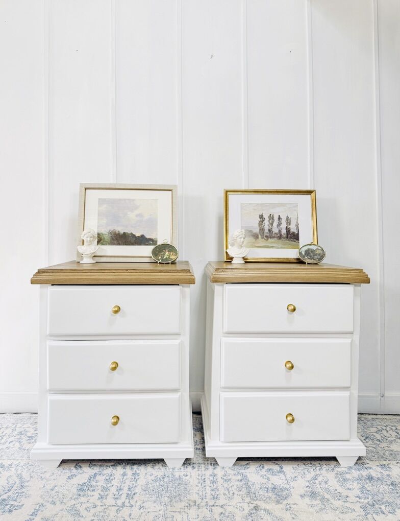 Refinished in linen white with faux wood stained top. This piece brings a fresh yet timeless charm to any space.