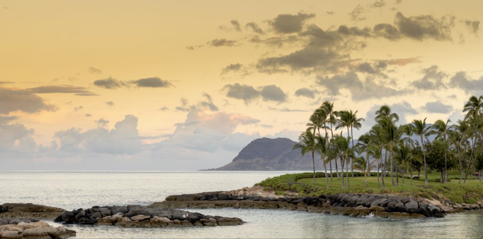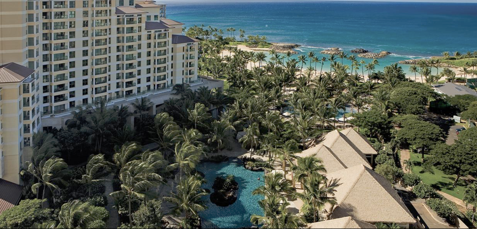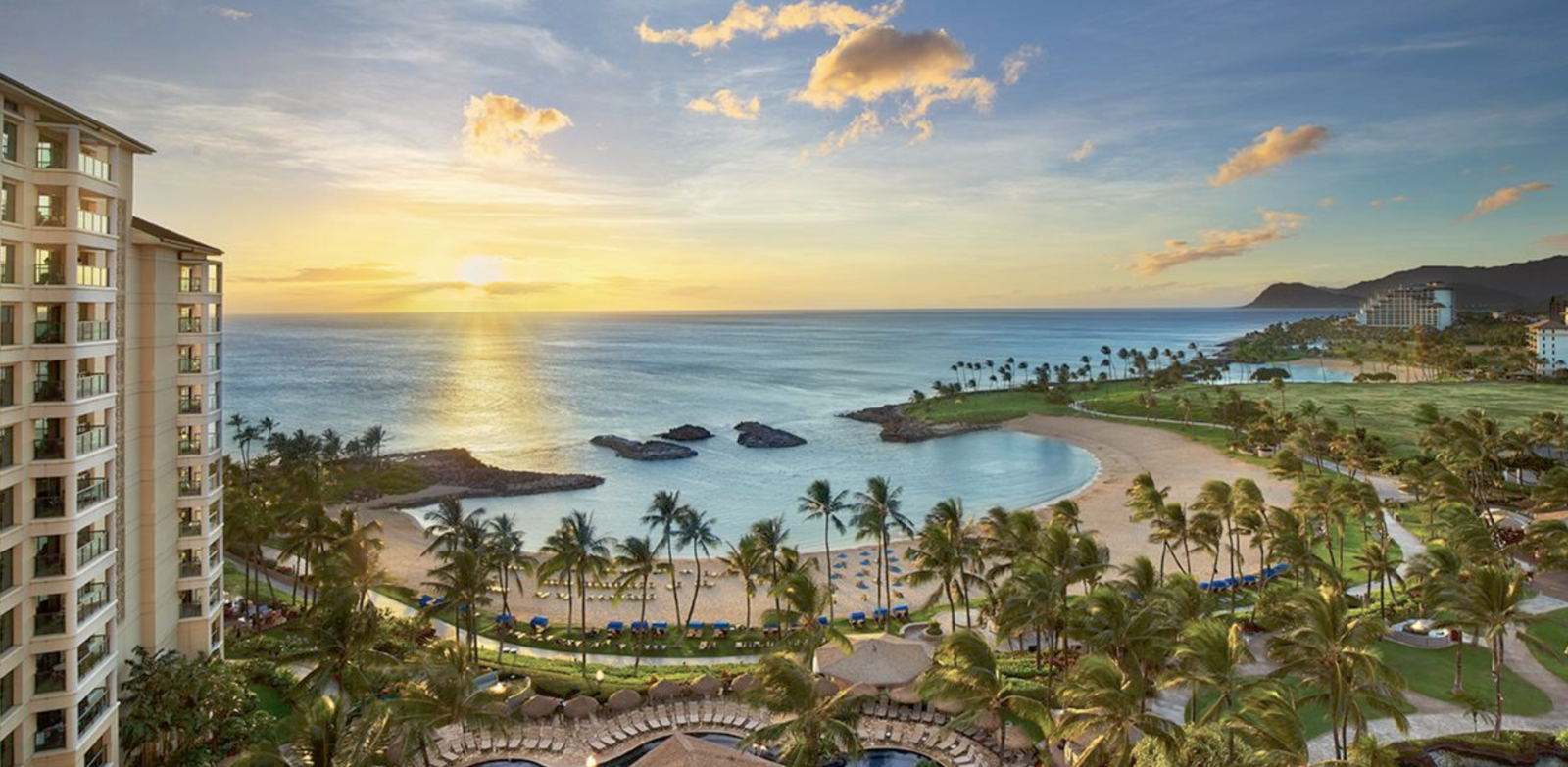 Ko Olina has 2 miles of coastal frontage and includes three natural and four man-made lagoons with white-sand beaches. Ammenities include four swimming pools, the Nai’a Pool Bar, Longboards Bar and Grill, fitness center, The Marketplace convenience store, umbrella and cabana beach rentals and daily activities program. Guests will also enjoy access to the JW Marriott Ihilani Resort & Spa and Ko Olina Golf Club and Marina.