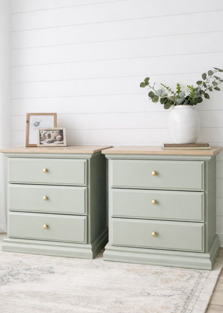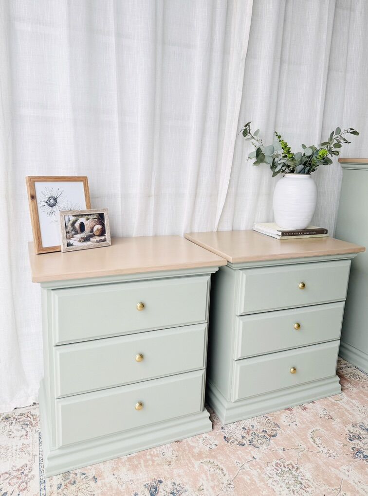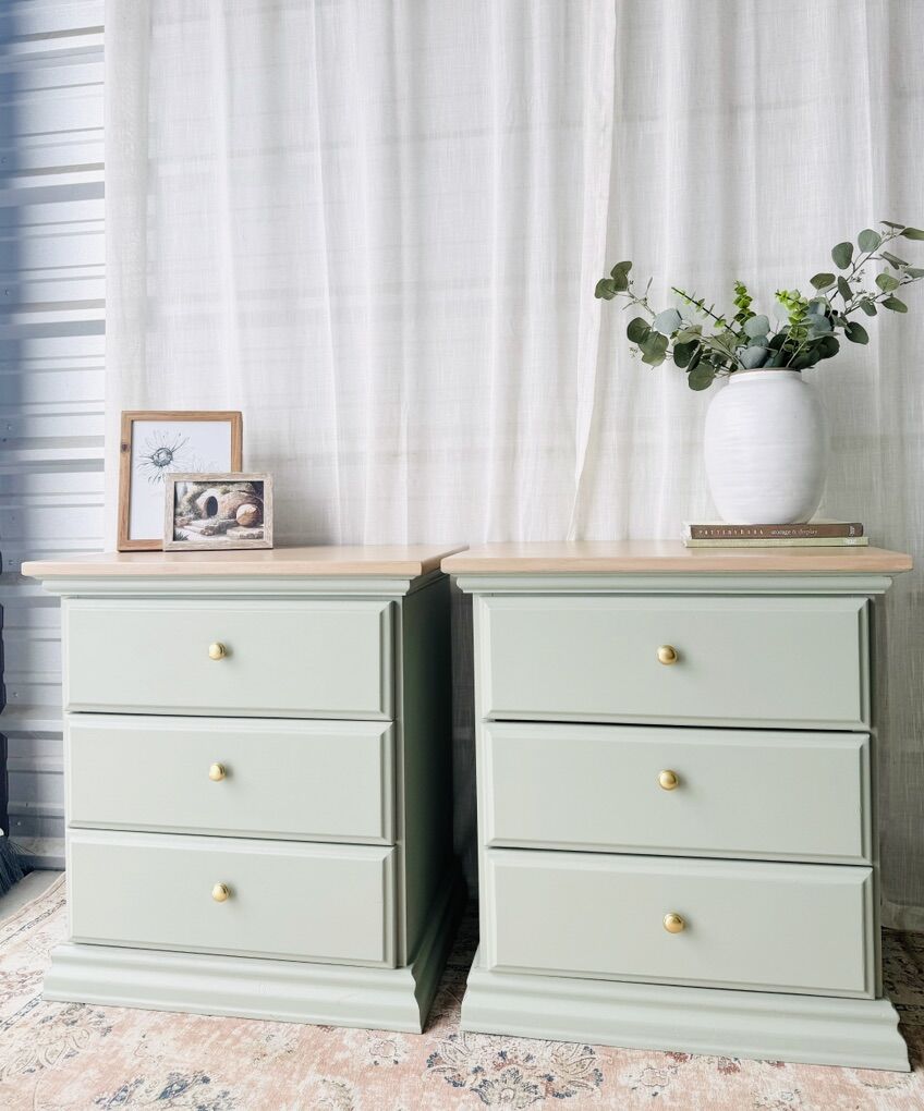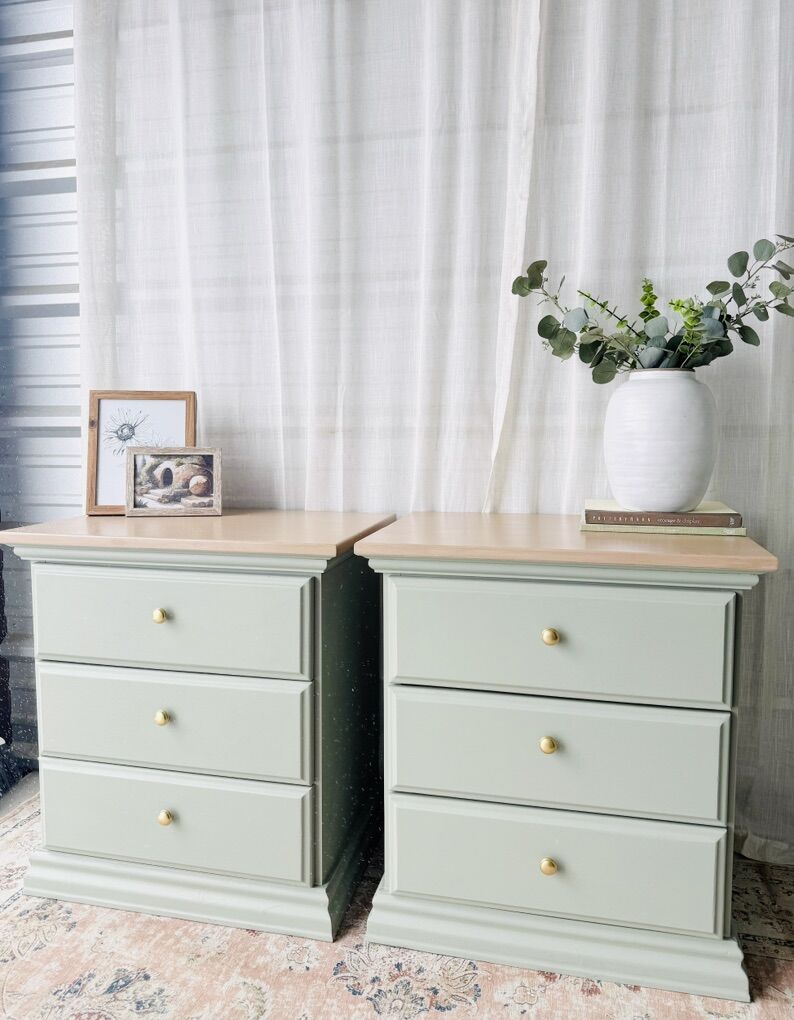 Refinished in light moody blue with hints of green & faux wood stained tops. This set brings a fresh yet timeless charm to any space.