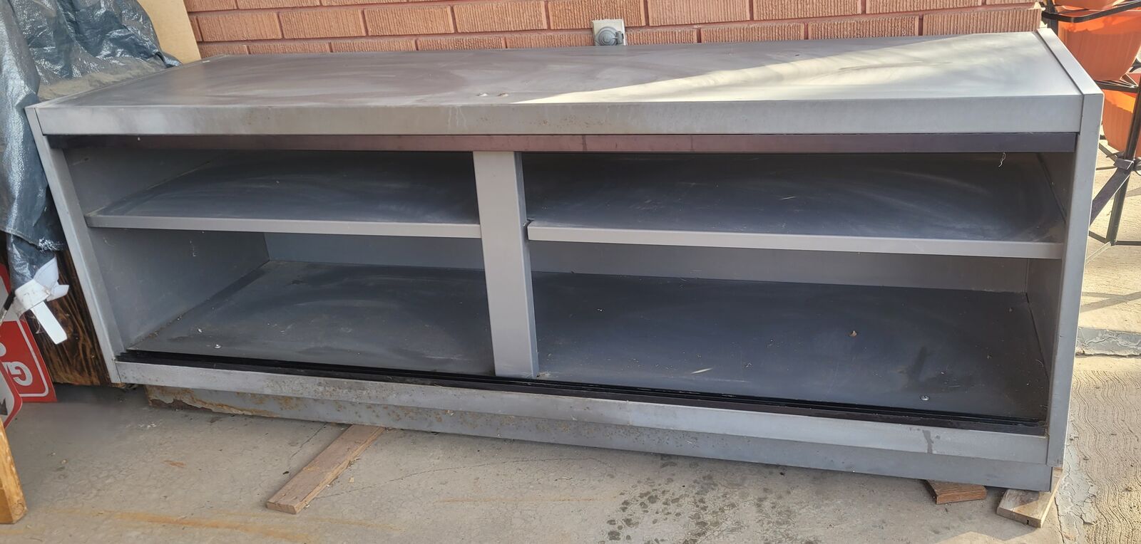 This is a really heavy duty, sturdy storage cabinet. Does have some surface rust and rust around some botom areas. Cleaned up and repainted, this would look great. Cabinet has removable doors. Cabinet size is approx. 72 inches wide, 22 inches deep, and 27 inches tall. Cabinet is very heavy. Due to three back surgeries, I will not be able to deliver or help load. Will need at least two strong people to load this up.