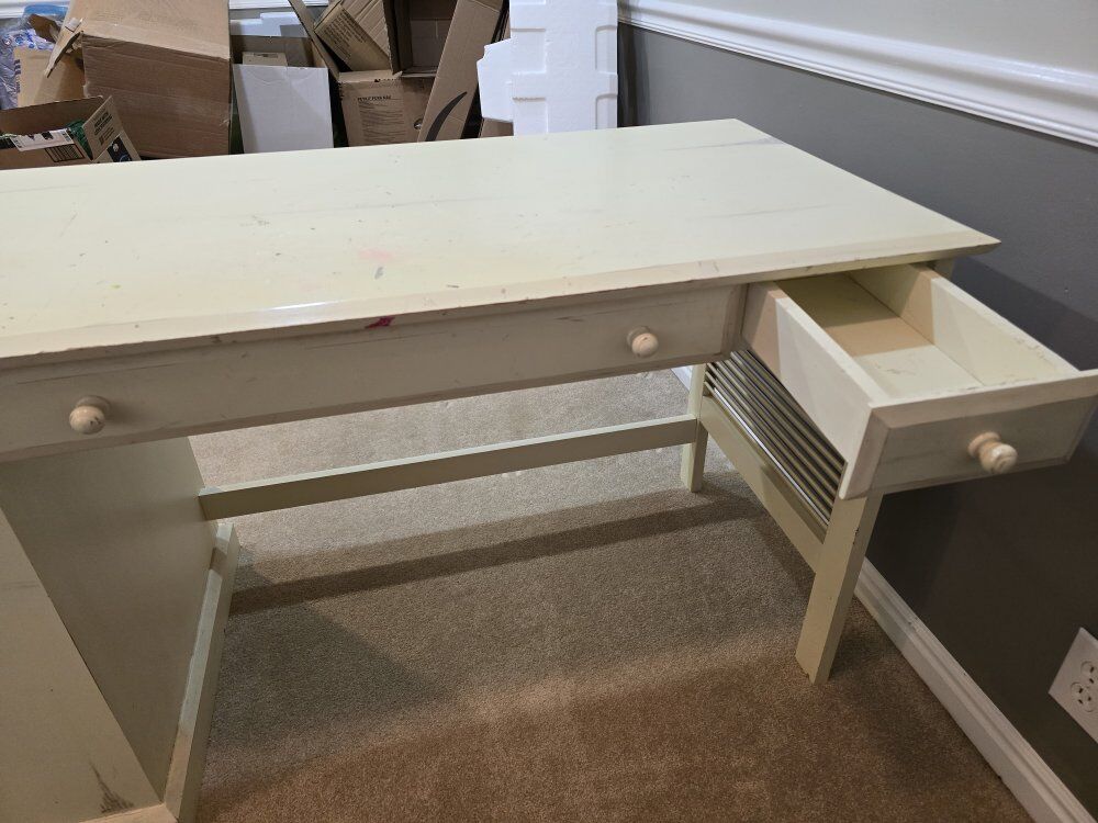 CashAppThis is my childhood desk and I'm sad to sell it, but we're moving and it needs a new home. It has been used as a crafting desk so it has a lot of character and would be perfect for an artist, crafter, or messy person. I think it adds to the purposeful distressed look. It is very sturdy and still really cute. Pick up only. $100 OBO
