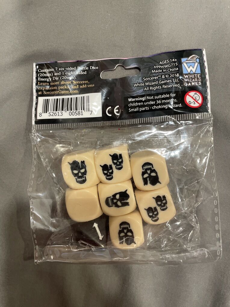 VenmoNew! White wizard Games, Sorcerer Extra Dice (Large) Extra dice help to speed up multiplayer games. Includes a D8 and 7 Combat Dice with custom symbols: pentagrams, double skulls, and single skulls. 7x 20mm Sorcerer battle dice and 1x 20mm 8-sided energy die.