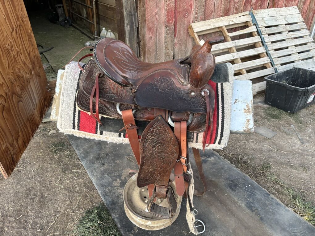 16.5” nice saddle. We bought it a few months ago and it needed some repairs. We repaired the stitching and it’s been great since. The only reason we’re selling is it isn’t the right size for us. The leather could use some conditioning but otherwise it’s a great saddle. Extra tack is not included. OBO