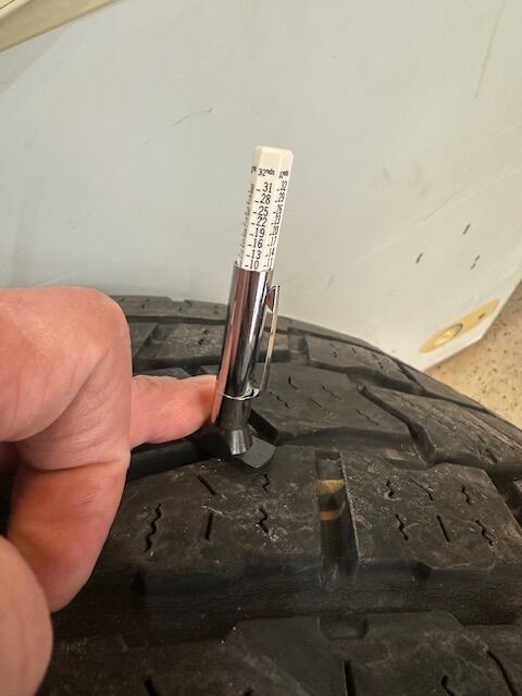 VenmoBIg-O Bigfoot AT2 Tire in great shape with 10/32 - 11/32 of Tread depthso a little over half the original tread. This is a fairly aggressive All Terrain tire.