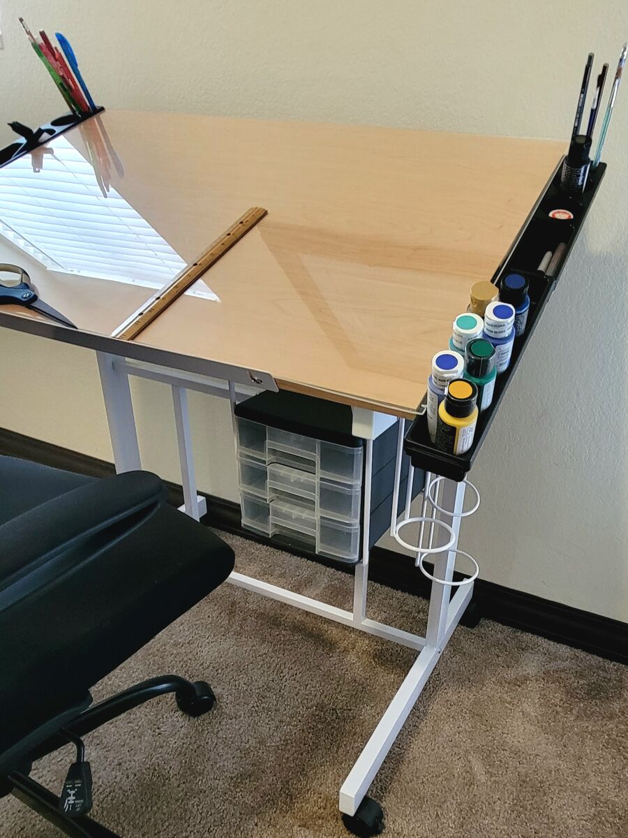 -This table includes a slide-up pencil tray and a metal glue gun holder with a drip -tray.