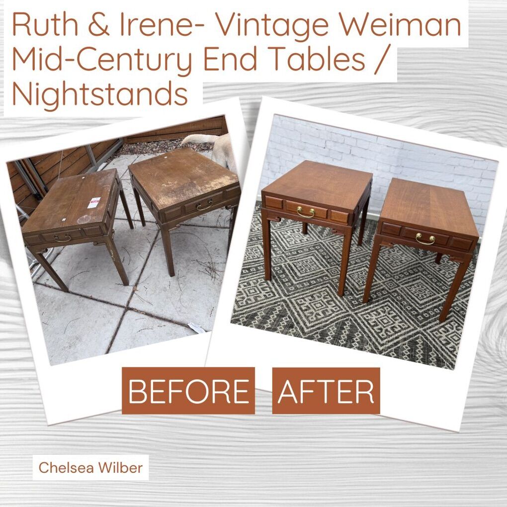 VenmoMeet Ruth and Irene- a pair of matching vintage Mid-Century solid wood end tables / nightstands. They have been newly refinished to showcase the natural warm tones of the mahogany wood.