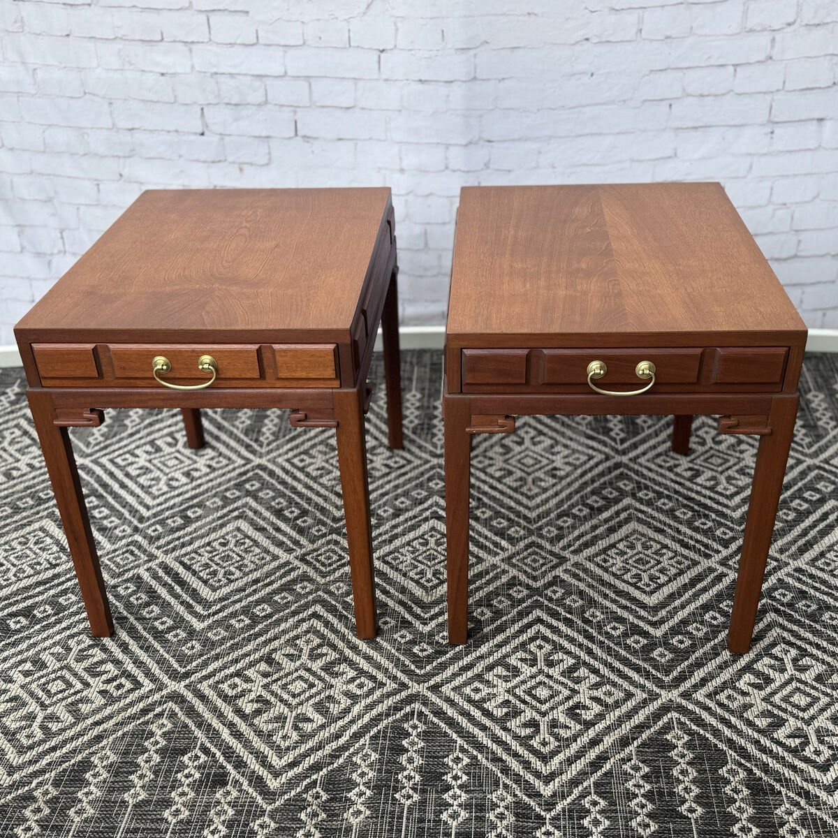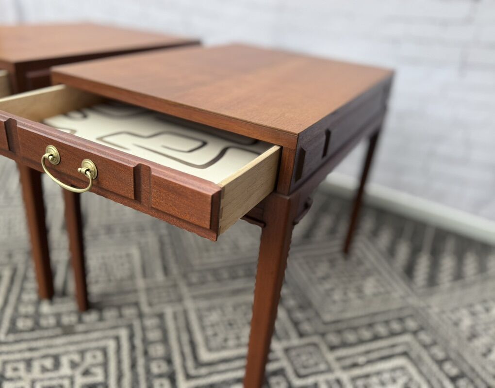 Ruth and Irene can be used as accent tables, end tables, or matching nightstands. They feature geometric detailing along each side panel, drawer fronts, and inside corner of each leg. End tables each have one dovetail jointed drawer with its original solid brass handle, are freshly lined and slide smoothly.