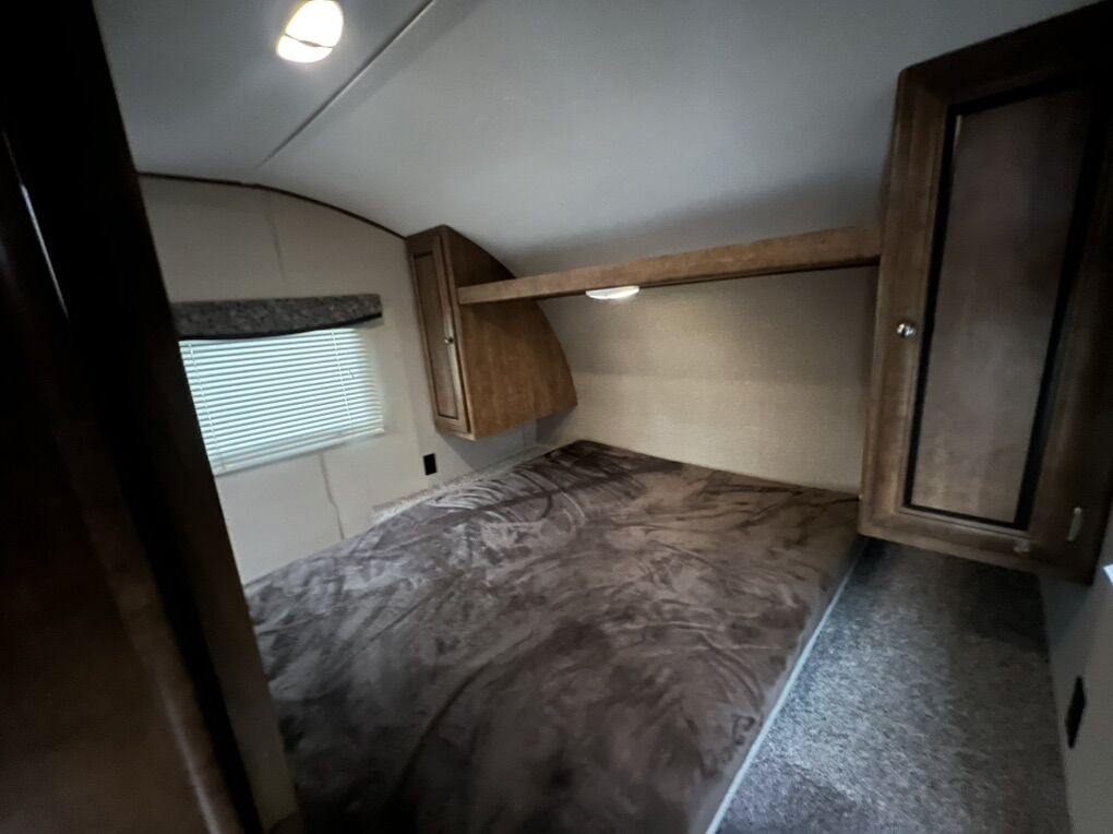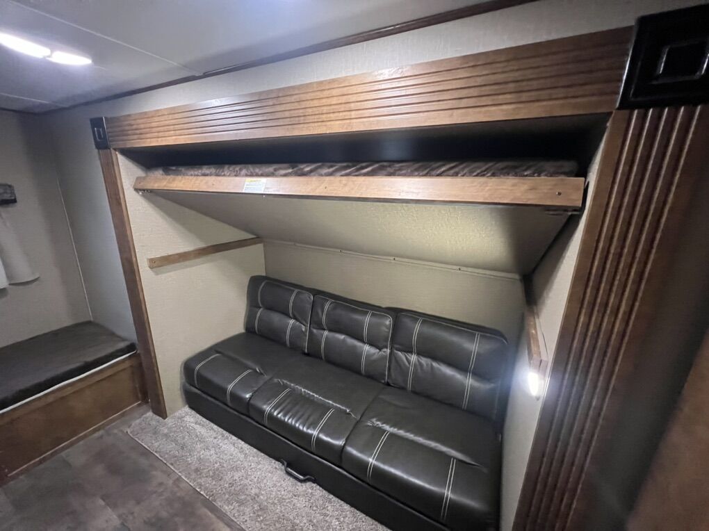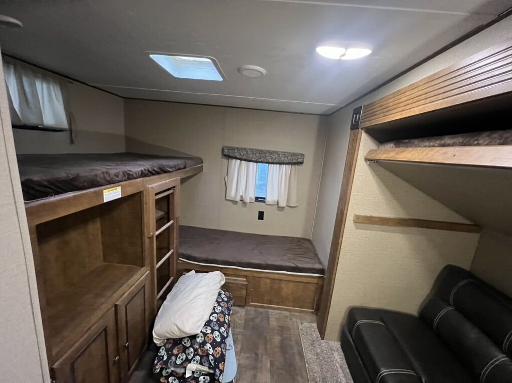 Trailer sleeps 9-10 people, has a separate bunk room that has 5 possible beds: 3 beds, a couch that folds down and a pull out trundle bed all in the bunk area. Living area has a couch that folds down and table that can be turned into a bed. The main sleeping area is sized for a queen bed.