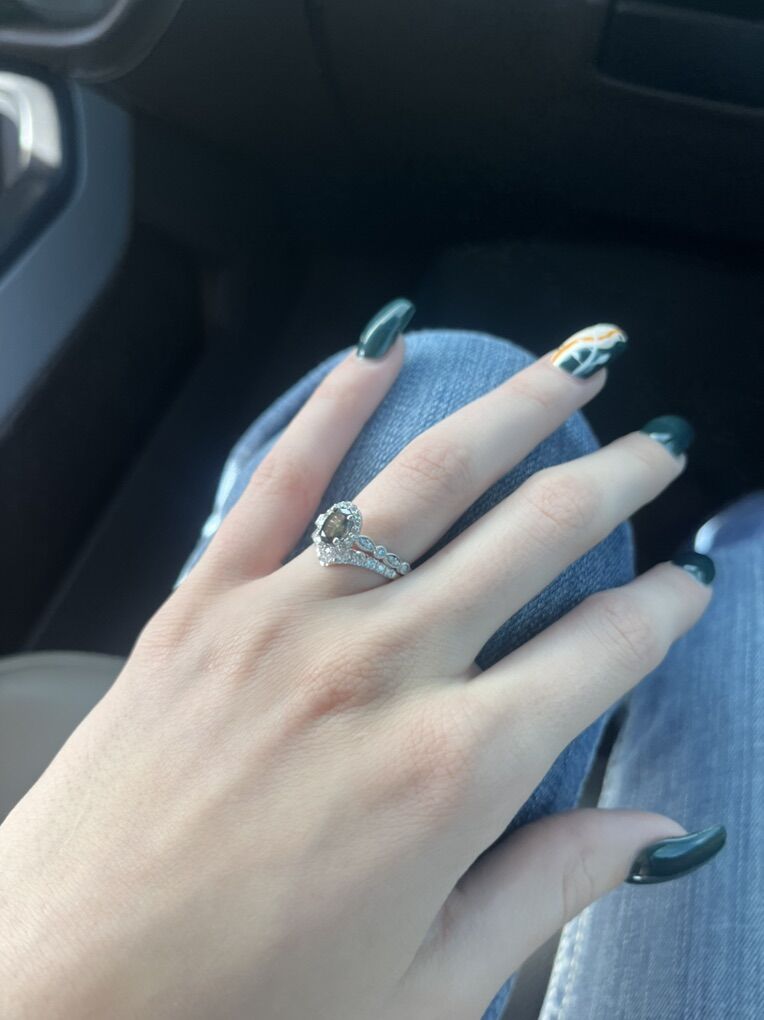 3/4 Karat Salt and Pepper Diamond center stone. White gold bands. 5 1/2 size