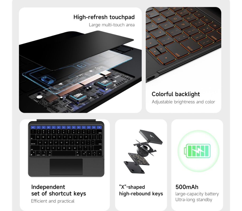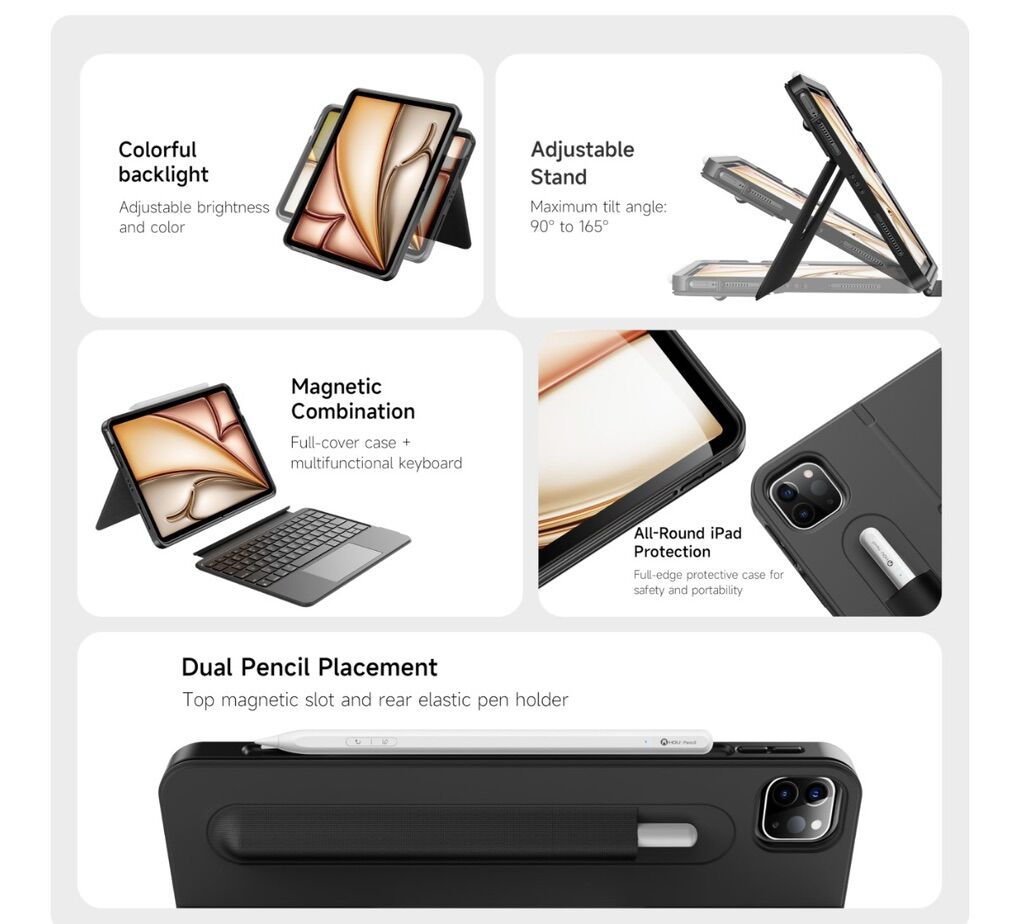 HOU iPad Air 11 Case with Keyboard (M3 2025, M2 2024) Detachable Rotatable Magnetic Full Protection Case, 7-Color Backlight, Touchpad, Elastic Pen Holder for iPad Pro 11 (4th-1st) & Air (5/4th)–Black