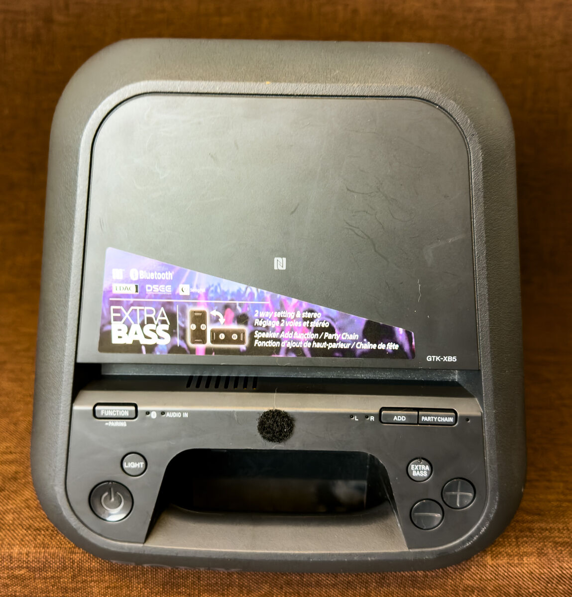 ZellePortable powered party speaker. Bluetooth, NFC, or cable party chain. High power audio and intense bass. Built-in synced LED and strobe lights. Vertical or horizontal orientation. Controlled either by panel buttons or through the Sony Music Center app. Great condition, ready to use.