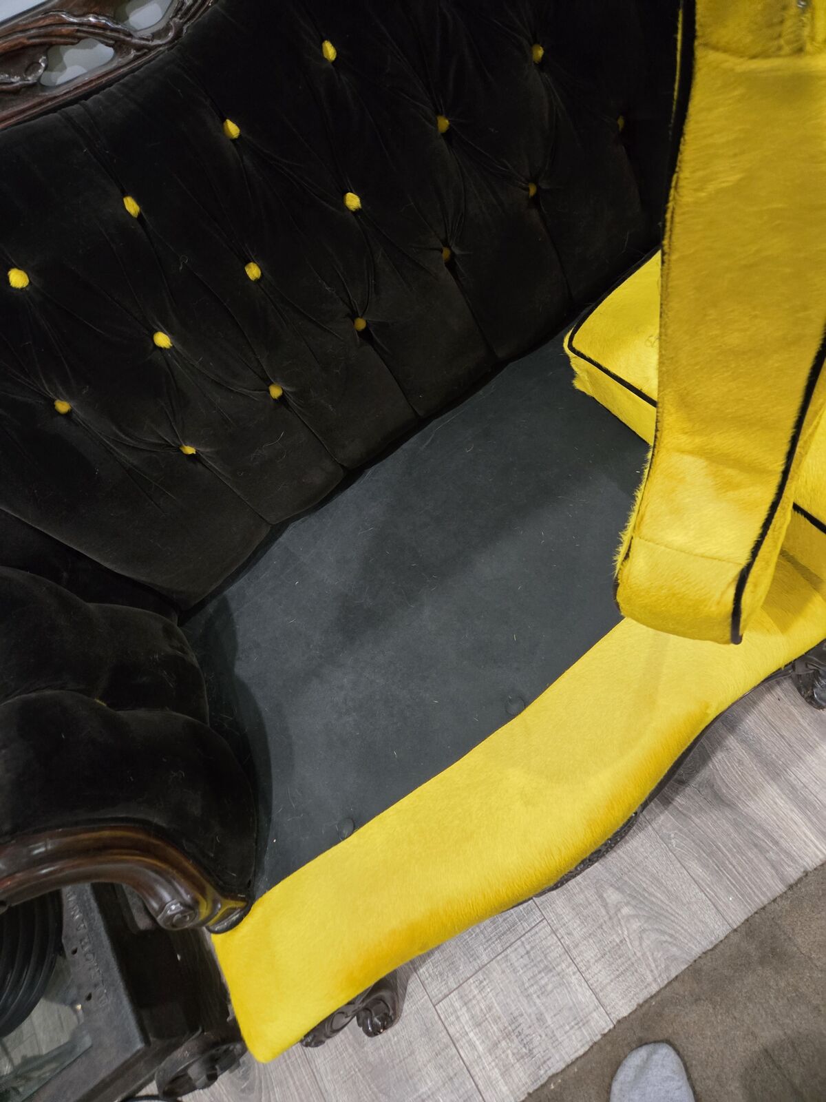 Beautiful vintage carved wood sofa with dramatic tufted velvet back and custom yellow cushions. This is a true statement piece.