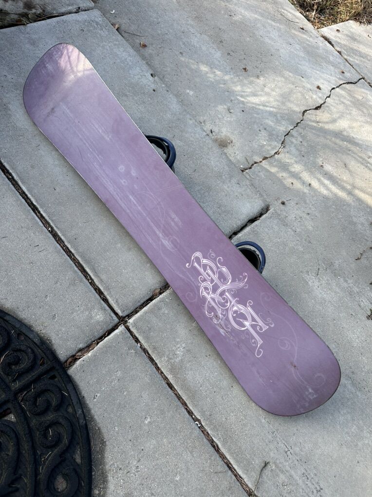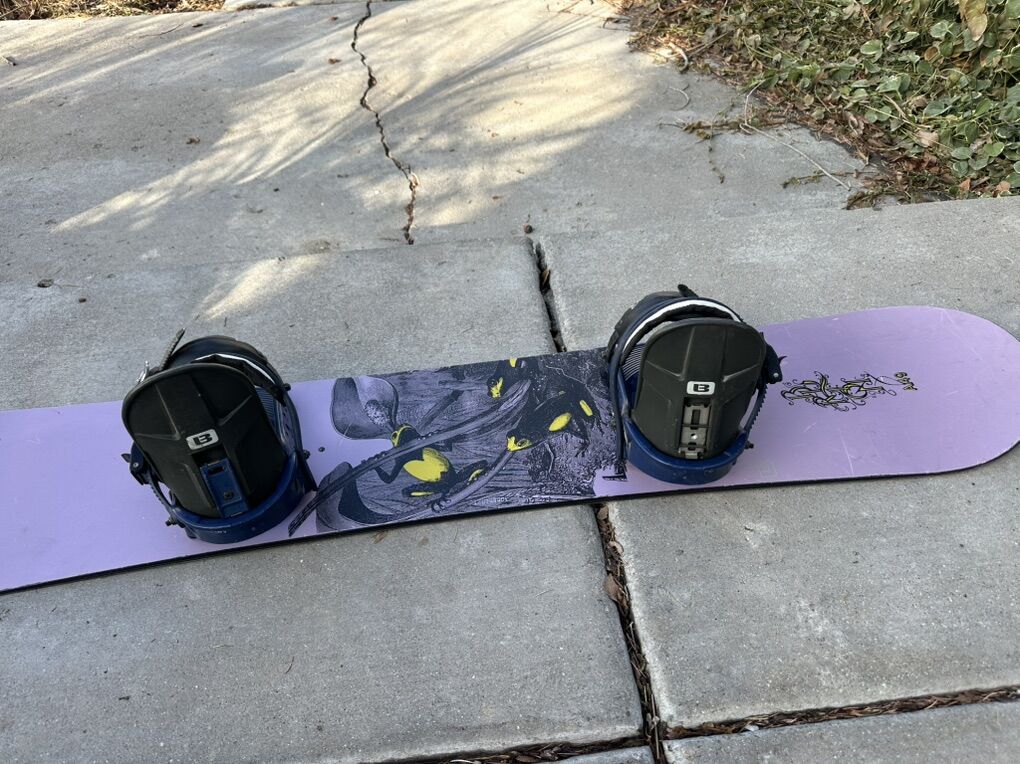 Burton A49 is 149 cm and is kind of a purpleish shade with graphics in the middle. It has Burton bindings. Edges are good, and bottom is good mostly surface scratches and one spot a little deeper. I have taken a photo and attached it for you to see. I take cash or Venmo, but cash is preferred. Text is best. 801-201-4446. Check out my other ads for additional sizes and styles.