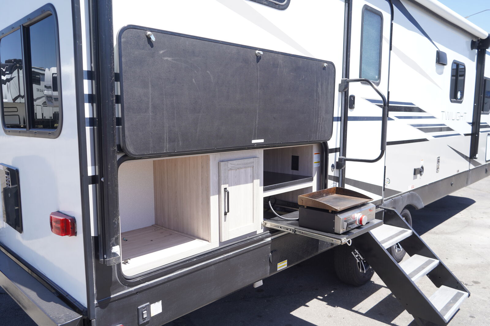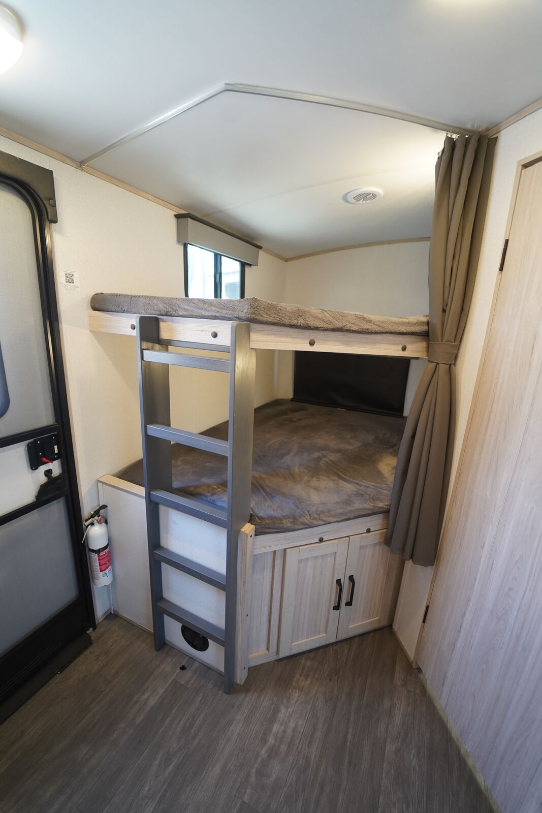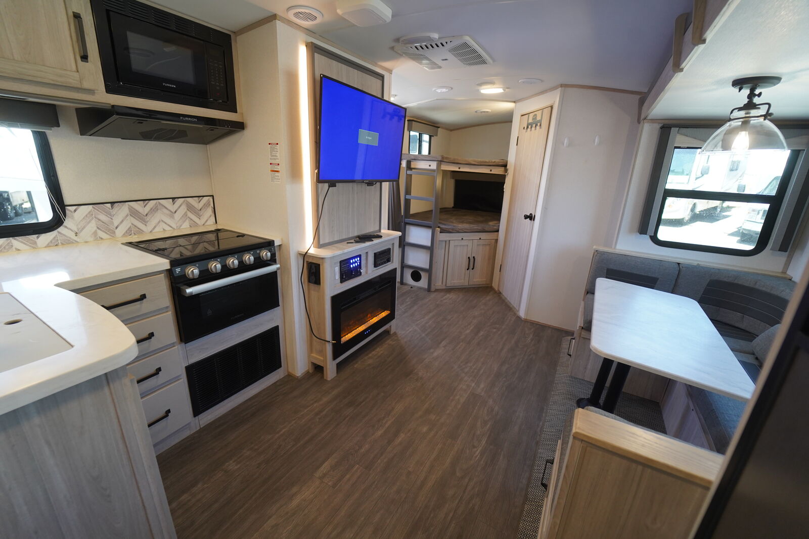 The TWILIGHT 2580 is an AWESOME trailer that meets all the needs of an INCREDIBLE MID-SIZE BUNKHOUSE! It is SUPER SPACIOUS, but NOT TOO BIG! It features a cool FRONT KING SIZE BED that shifts to the side to create more space when needed. It also has a VERY NICE mid-section main living area with a flat screen TV and Fireplace, GIGANTIC PANTRY, nice kitchen layout with the COVETED GAS/ELECTRIC REFRIGERATOR! The rear has double over double bunks and an ALL ENCLOSED BATHROOM.