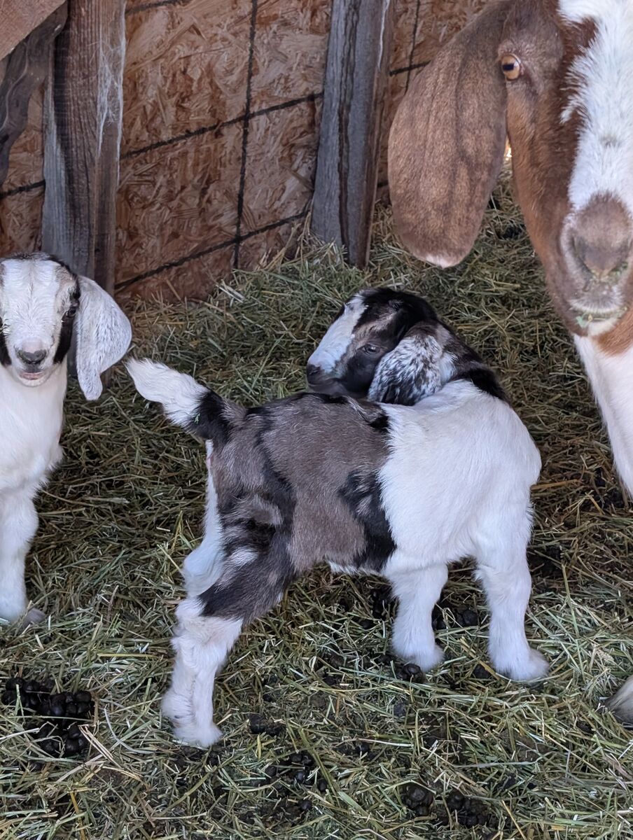 VenmoMy son has a small goat herd with babies that need to find new homes. They would be great 4H or FFA projects. We have one castrated buckling born Thanksgiving 2025 still available. He's eating hay, doing great, and ready to go. We also have 3 doelings and a buckling born February 3rd and 4th that can be reserved and will be available when they are 6-8 weeks old. The younger buckling is the one with two spots on his front left. Asking $350 each. Moms look more traditional with some dapple coloring and our Billy is dappled. They all have some dapple coloring except the one doeling is almost completely white.