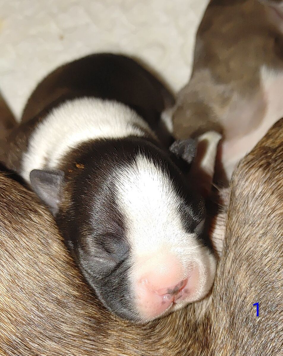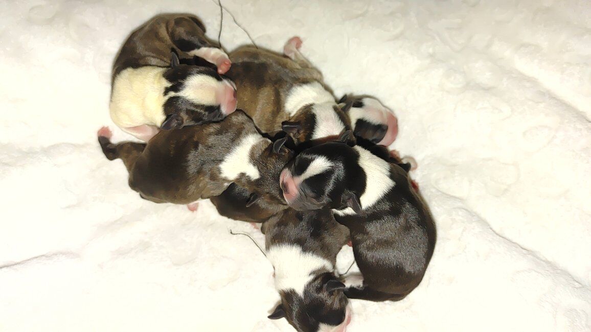 Gorgeously marked, silky soft, chocolate and brindle Boston Terrier puppies were born to Dam Jazzy (weighs 15 lbs.) and Sire Jax aka Jak Jak (weighs 19 lbs.) in a litter of four.