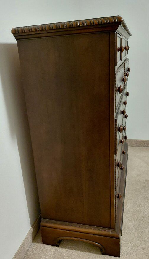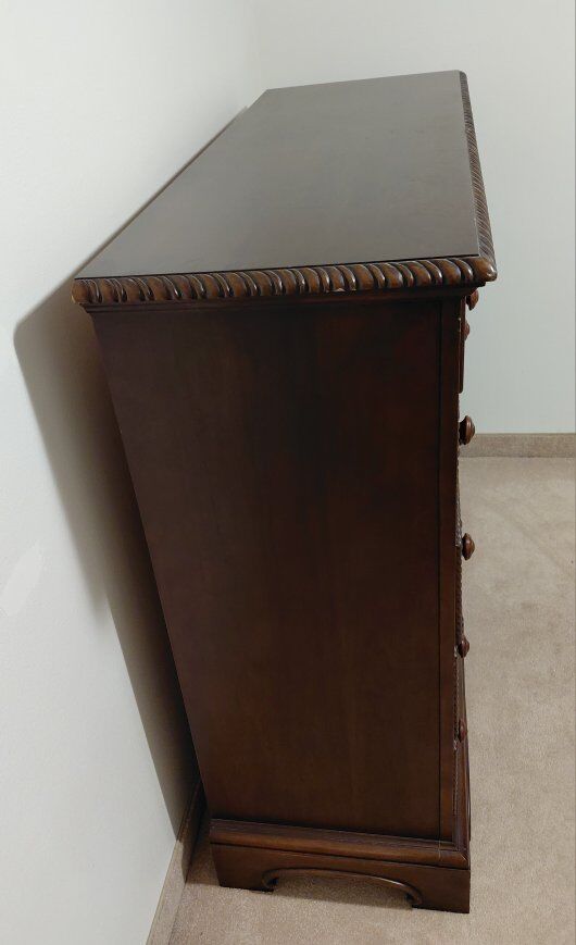 This Dresser is Heavy and Solid Wood. In great condition. Vintage. Has some light scratches that can be filled in with polish.