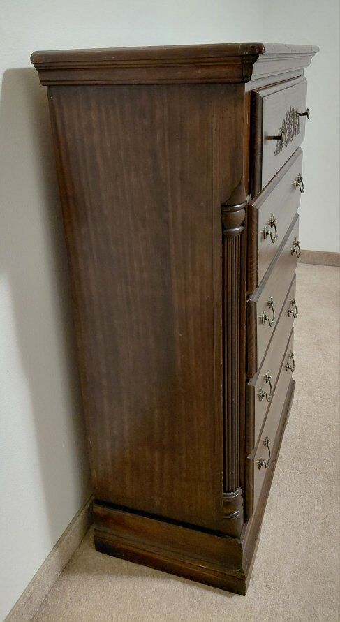 Tall Heavy Dresser. In great shape. It came with a slight chip on the right side towards the back and a light scratch when I bought it. It was so beautiful that I bought it anyway.