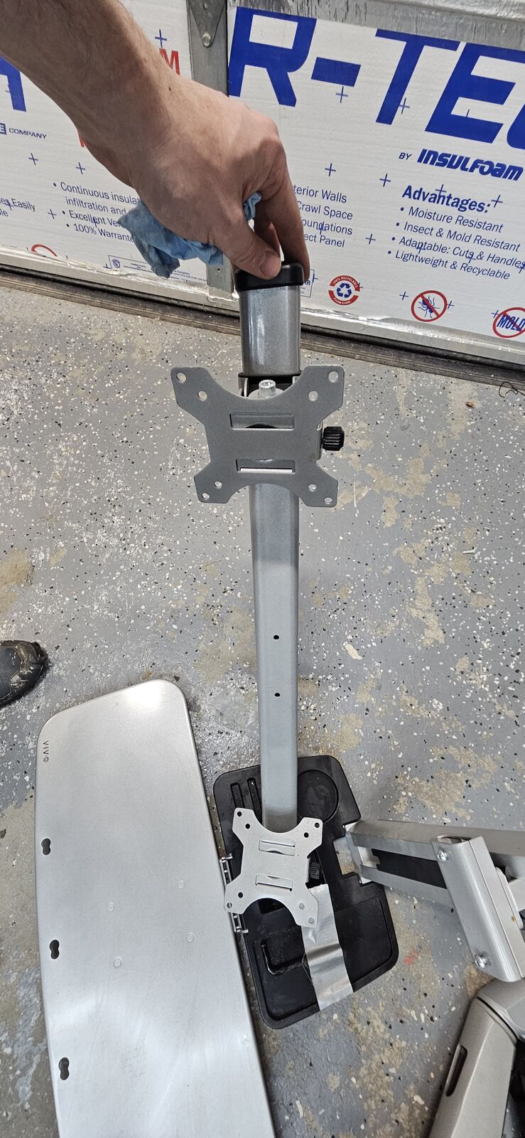 It holds a keyboard and the monitor and mounts to your desk like a monitor mount. I used it for years at my office to have knee clearance for my desk cycle.