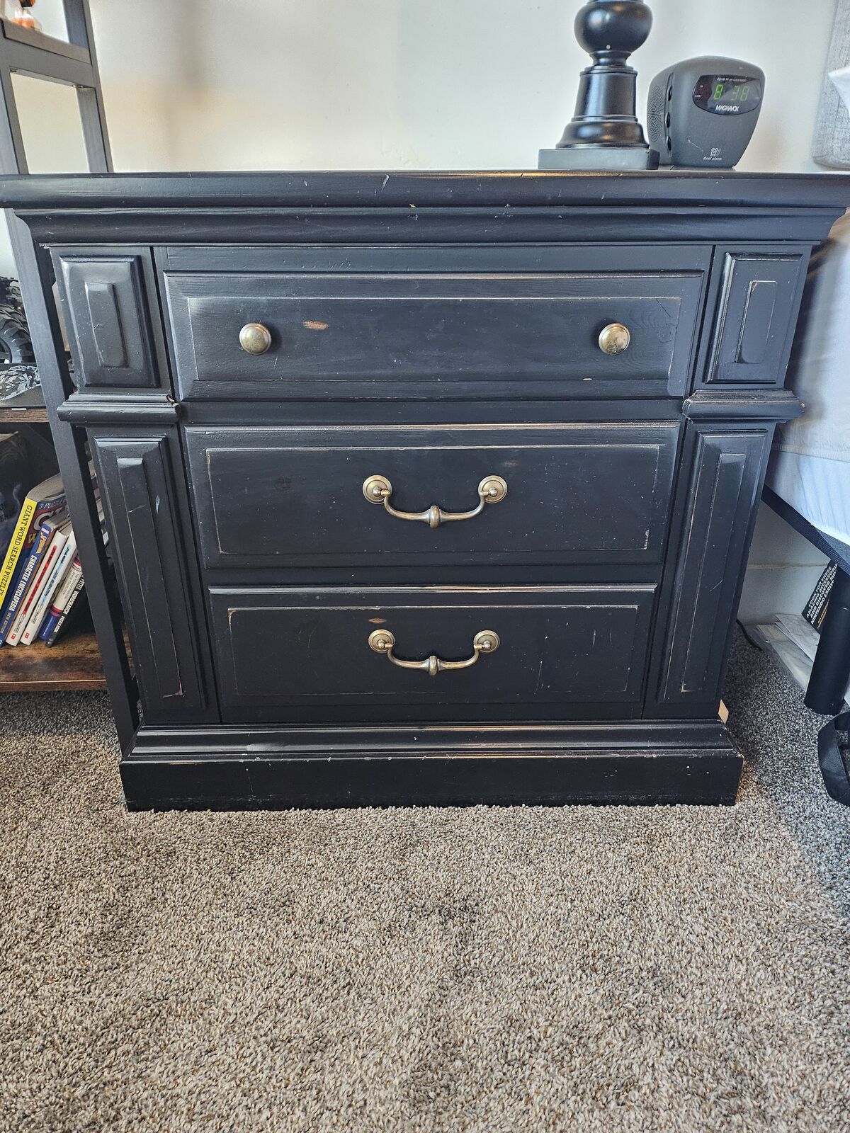 CashAppKing Size- Progressive Furniture Torreon Bedset in Antique Black with 2 drawers at foot of bed, 2 night stands- 3 drawers each, 1 tall dresser with 5 drawers and very comfortable pillow top King Sized Baron Corsicana mattress 460 foam with King Gold wood foundation included. Will throw in free 2 King Sized comforter sets with skirts, pillows cases, shams and decorative pillows (will show to you at pickup). Moving! Must sell!! $800 for everything OBO. Has some natural wear and tear from moving through the years. Had to use some stock photos as it is taken down and I couldn't get some live pictures of it.