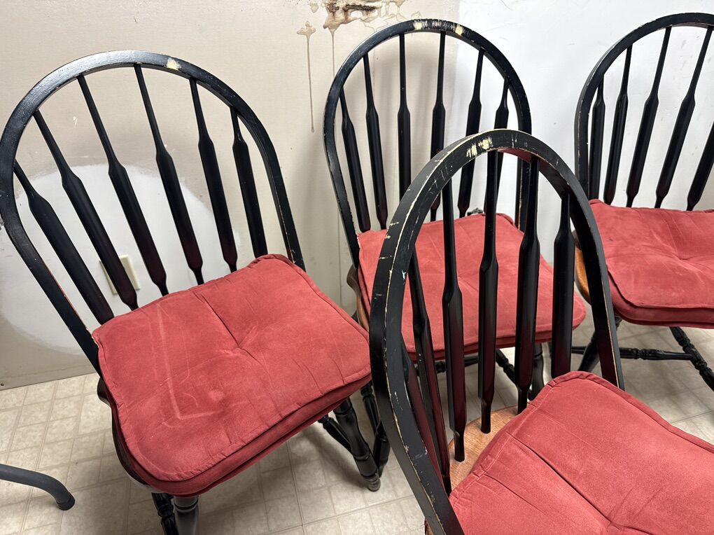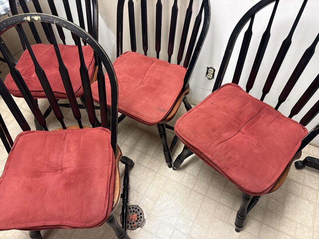 If you don’t mind the scuff - this is a good set of 4 matching wooden dining chairs with cushions that are tied in the back. Some are a little wobbly but for the most part are sturdy.