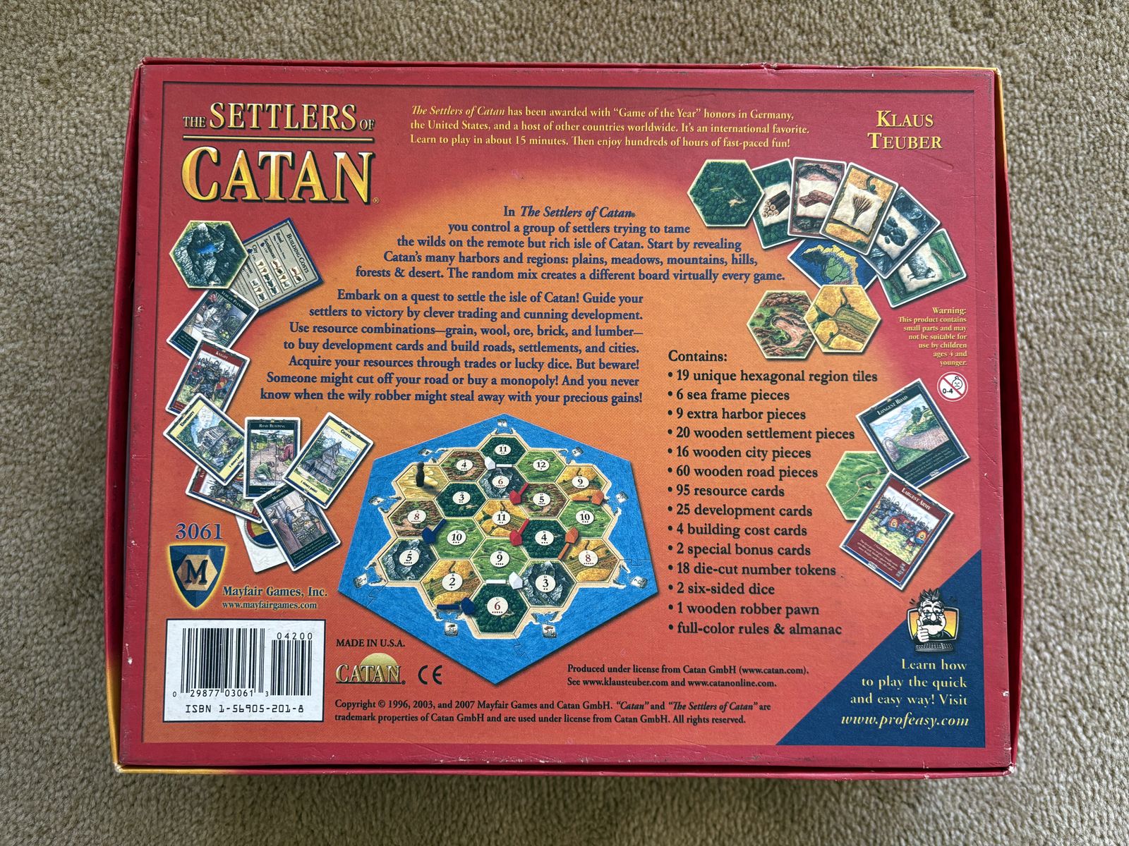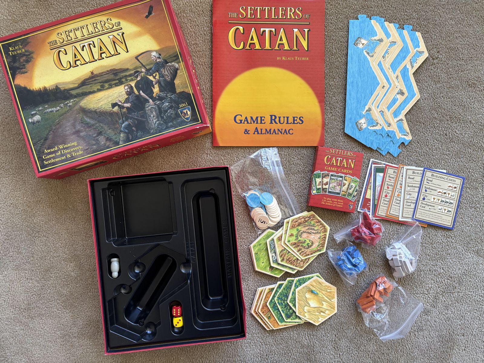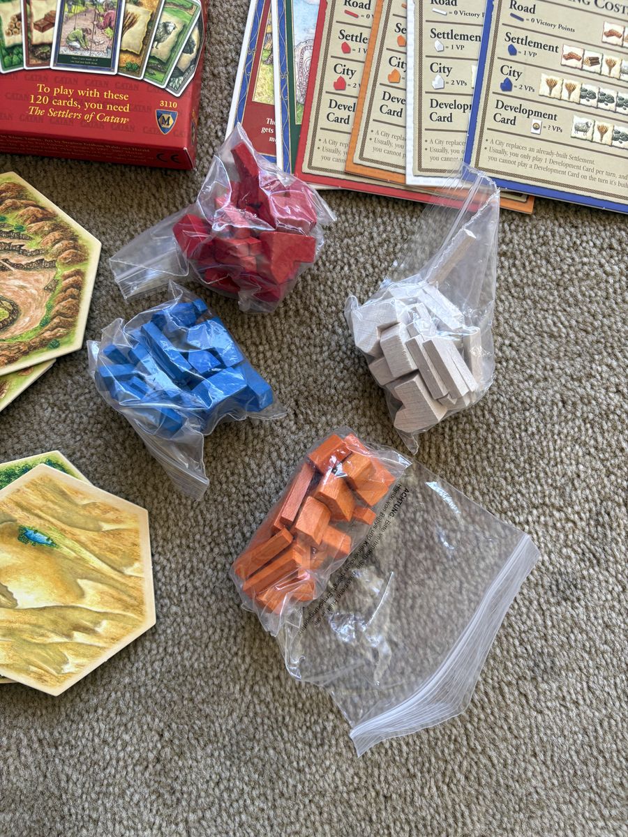 COMPLETE 2007 The Settlers of Catan: A game of discovery, settlement and trade. Award winning game by Mayfair, Klaus Teuber, 2007. Complete, no missing pieces. Very good condition. Box slightly bent (see photos). Text only. Cash or Venmo. Discount on multiple items.