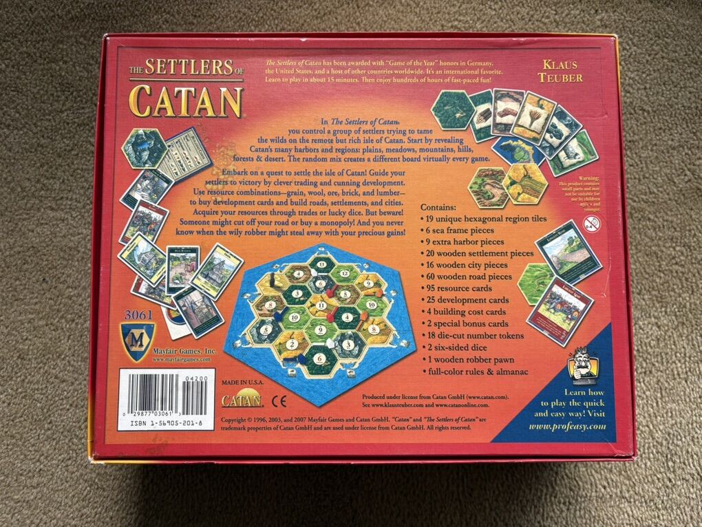 COMPLETE 2007 The Settlers of Catan: A game of discovery, settlement and trade. Award winning game by Mayfair, Klaus Teuber, 2007. Complete, no missing pieces. Excellent condition. Text only. Cash or Venmo.