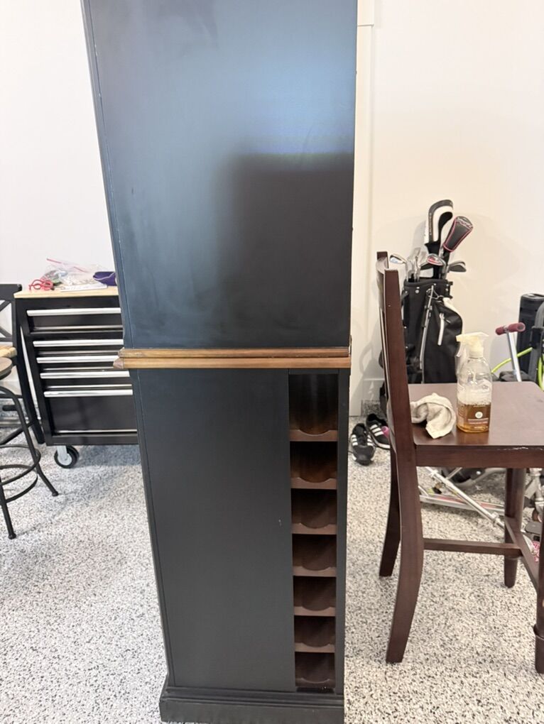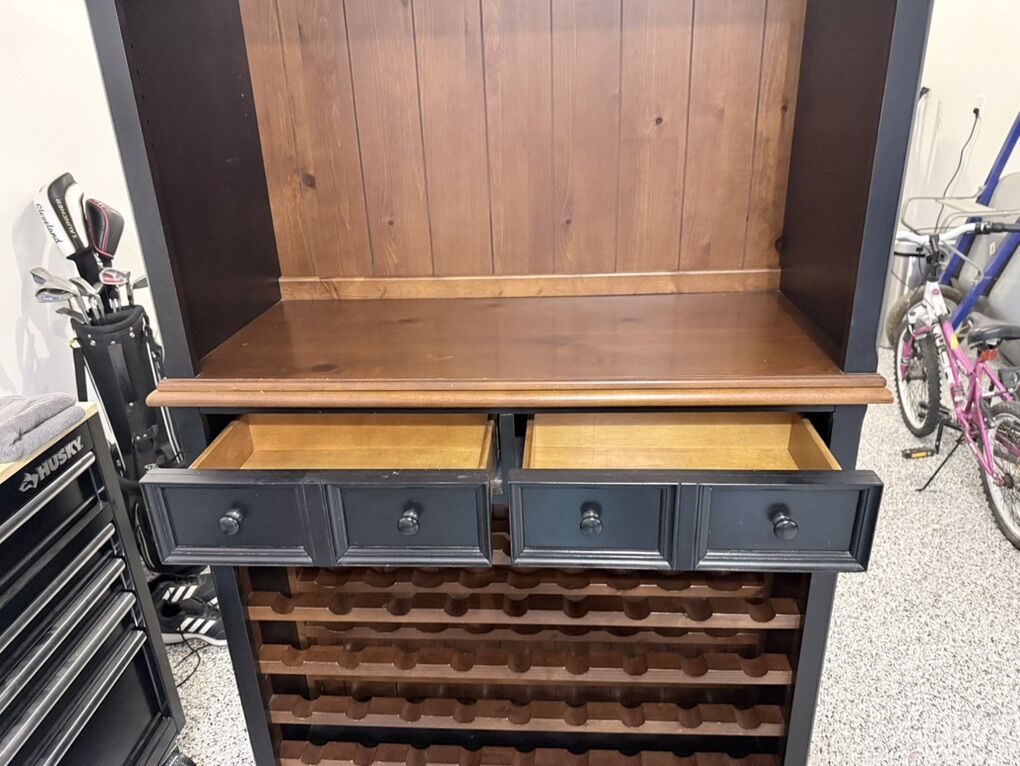 ZelleStylish wine bar cabinet. Has plenty of storage for your wine bottles with a large horizontal rack and a vertical side rack. Also has built-in holders for wine glasses. Two drawers for accessories. Black frame with natural wood interior and accents.