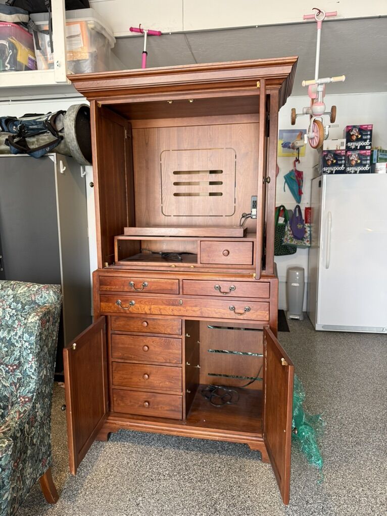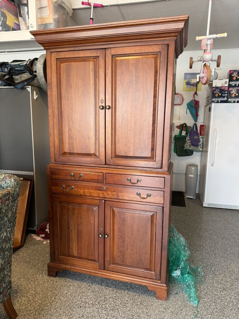 VenmoThis is a solid wood armoire wardrobe closet. It comes in two pieces making it much easier to move. I got it from my aunt’s Home in Park City but it won’t fit in the room I was hoping to put it in so I have to sell it. it’s in pretty good shape with some minor wear. Can be used in a bedroom or office or living room. Really nice piece of furniture though spent over 1500 bucks on it when purchased Located in Cottonwood Heights. Can accept cash or Venmo. Pet and smoke free home. 44 inches wide 21 1/2 inches deep 88 inches tall.