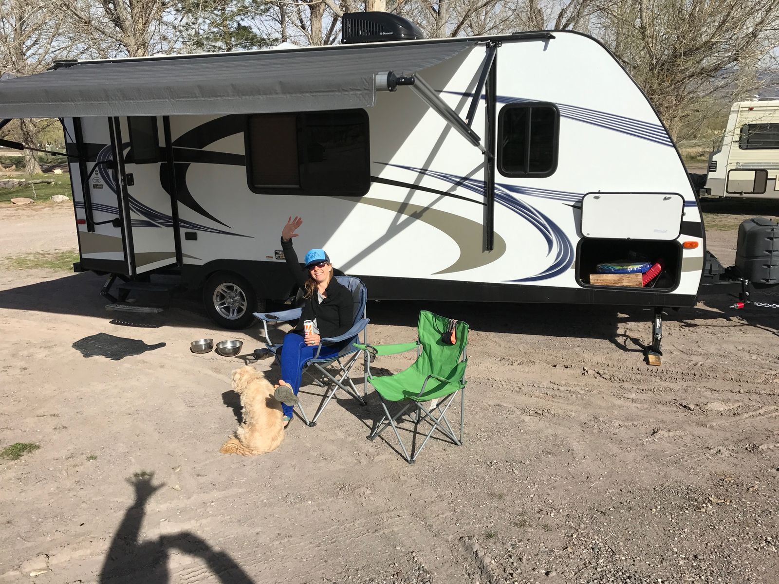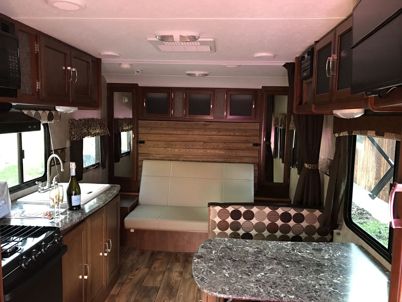 custom murphy queen sized bed (memory from mattress) that converts to sofa, 3/4 bath, skylight in shower, electric awning,16” Television DVD player / stereo - indoor and outdoor speakers, dinette folds to full sized bed ample storage under banquette seats, 3 burner stove (propane), microwave, mid-sized refrigerator (electric / propane),A/C and heat, 2 upgraded propane tanks included