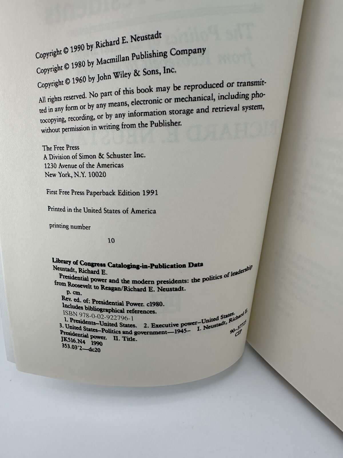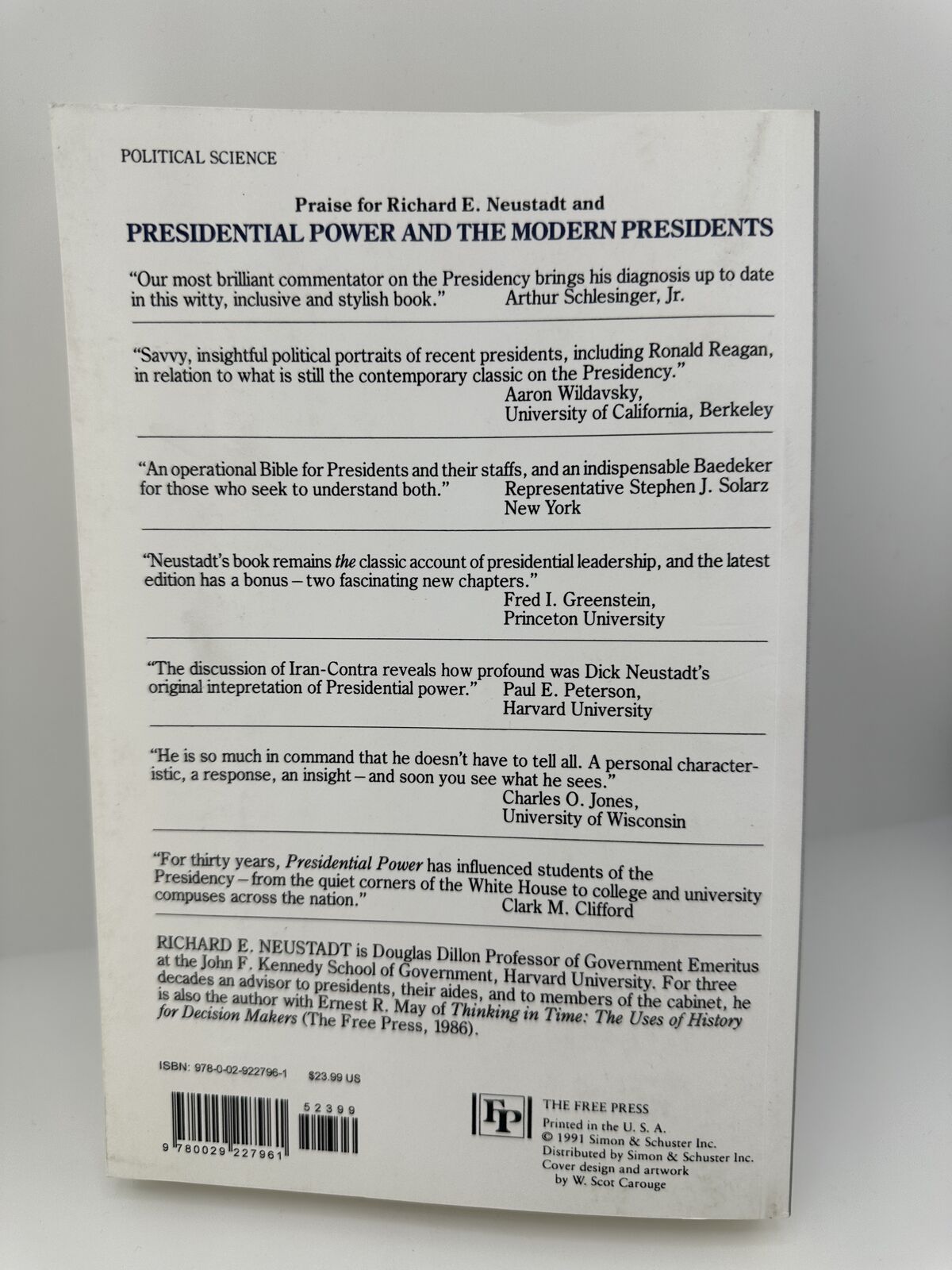 This 1991 Free Press paperback edition expands on Neustadt’s classic analysis of presidential authority, examining how modern presidents—from Franklin D. Roosevelt through Ronald Reagan—exercise power within America’s constitutional system.