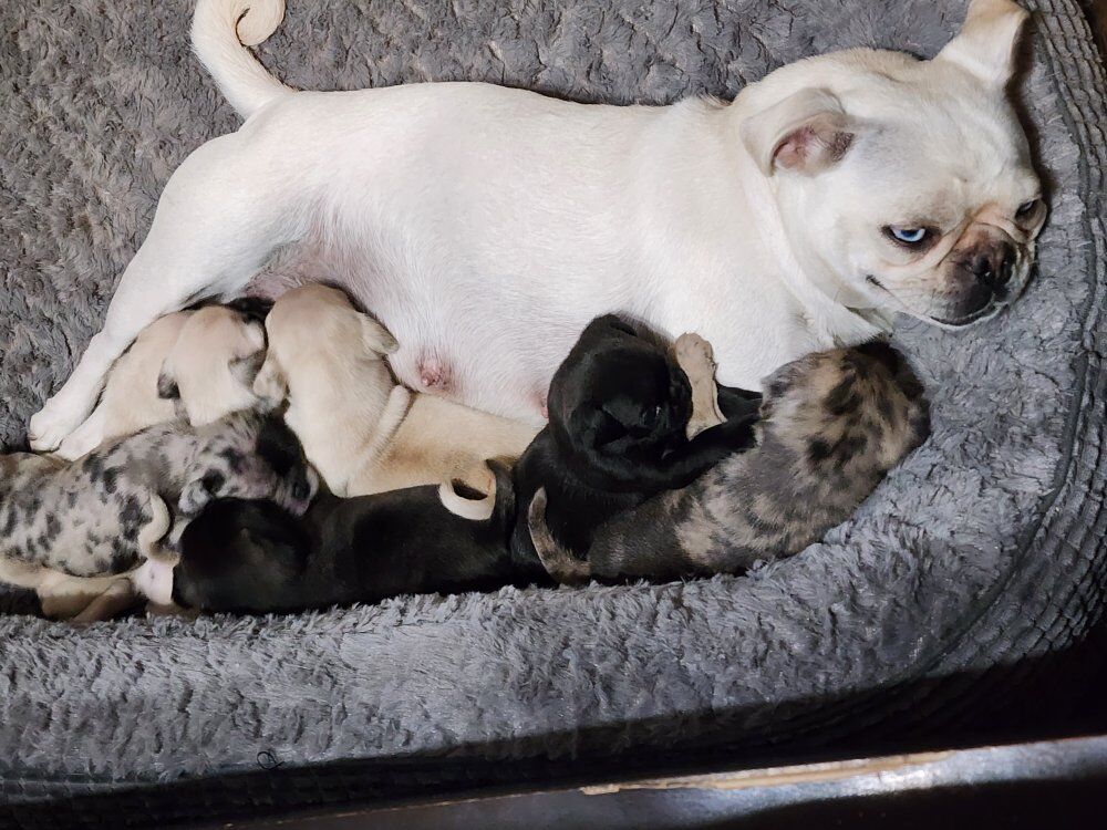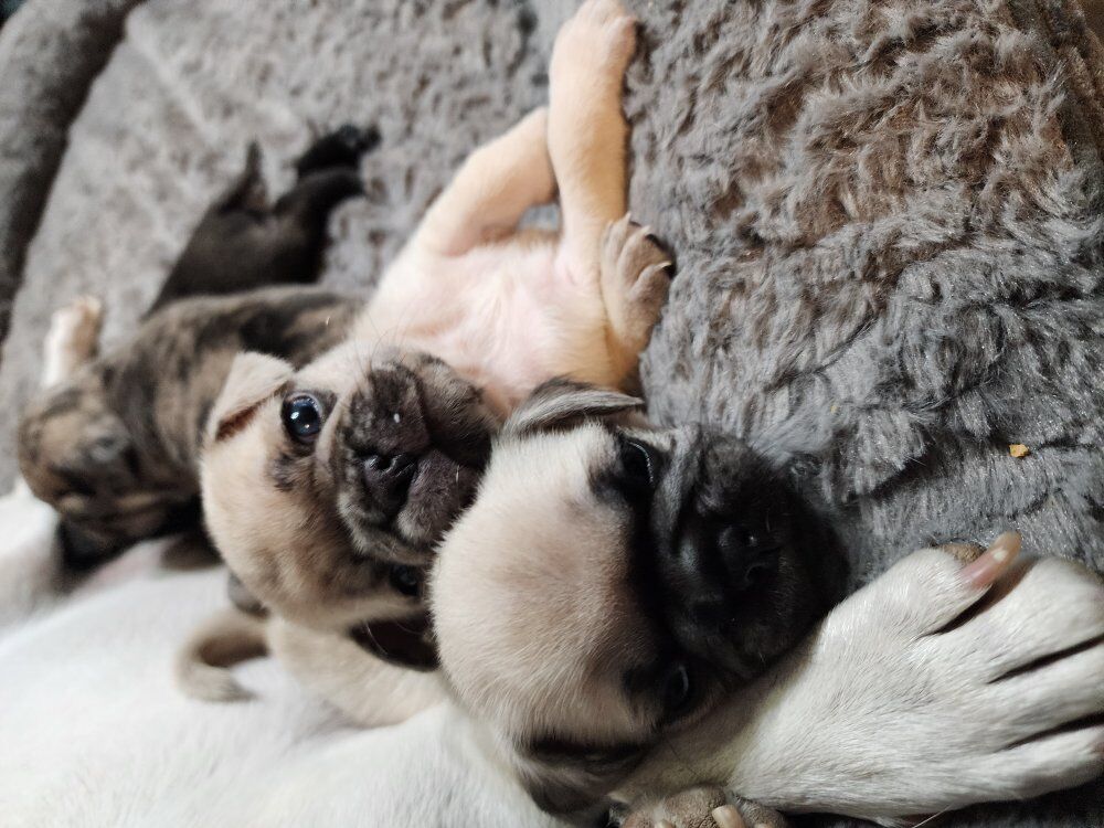 Dad is a Stunning 100% Black PLATINUM with Brown eyes *************************** VIDEO Link https://youtu.be/G0zq6IzQFeg?si=i6VQNGSy5It3Eqib Additional links below each available puppy **************************** For reference we included pictures of adult pugs from a previous litter. - My son kept their STUNNING Merle and he is available for stud service. We've also included his DNA test .... 100% Pug ************************** Also accepting waitlist requests for upcoming litters *************************** CASH AND VENMO-NO CHECKS