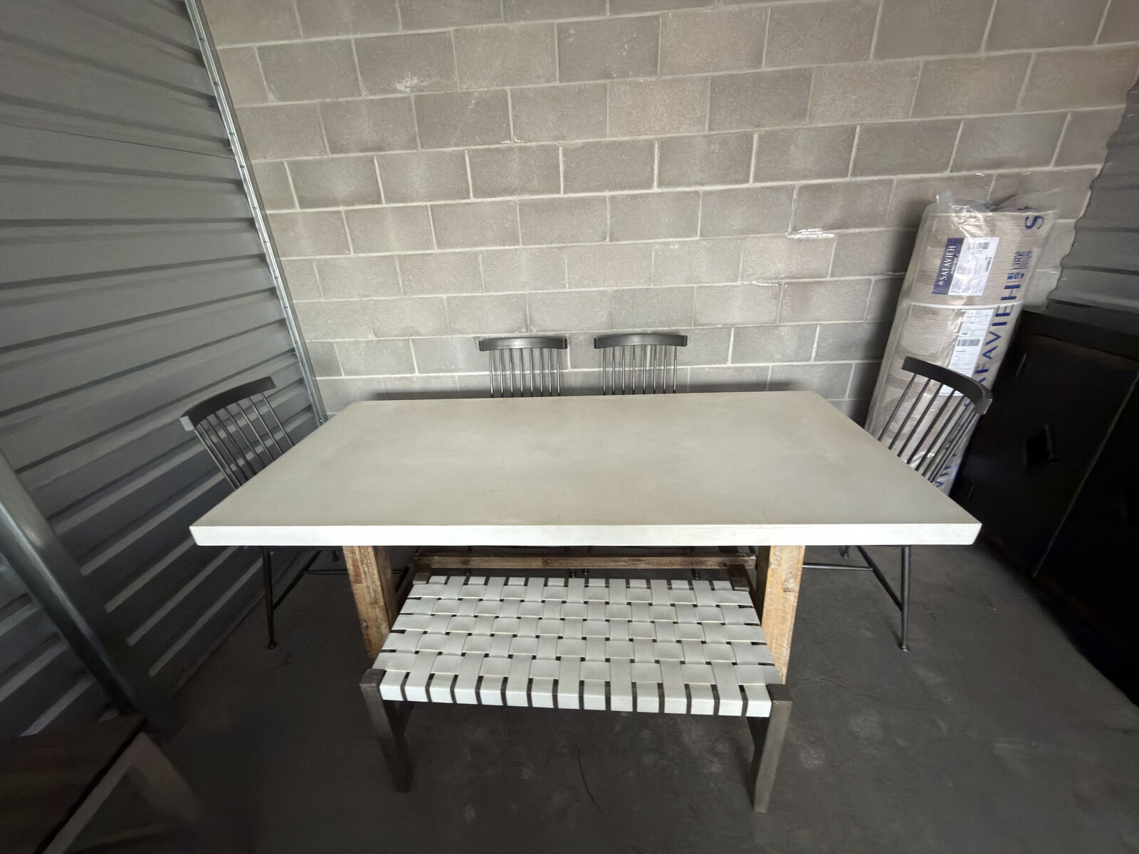 Beautiful and heavy dining set featuring a thick concrete-look slab top and solid wood base. Modern industrial design with a high-end Restoration Hardware style — a statement piece for any dining space.