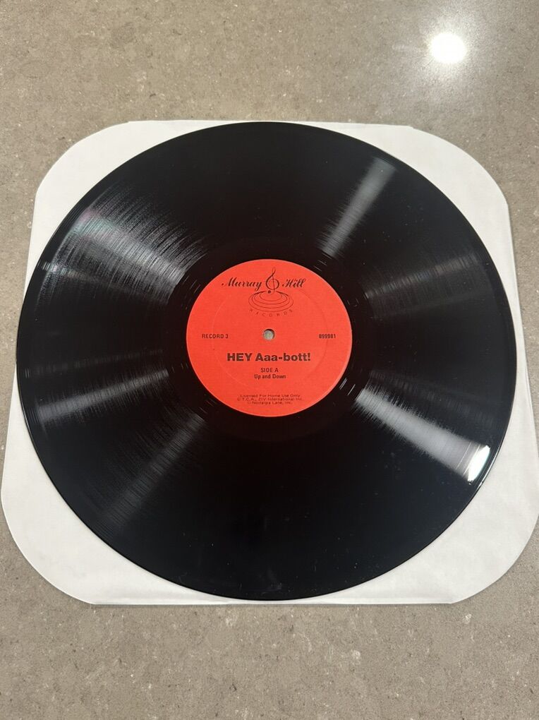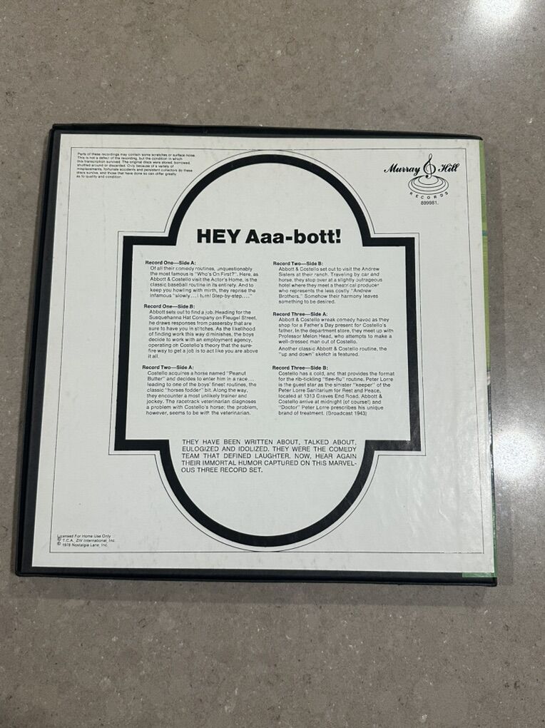 This is a preowned 3 vinyl album Box Set of Abbott & Costello’s comedy titled “Hey Aaa-Bott!” It was released by Murray Hill in 1978.