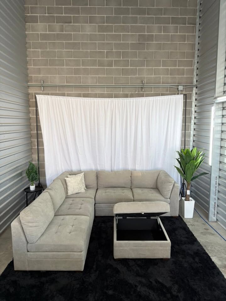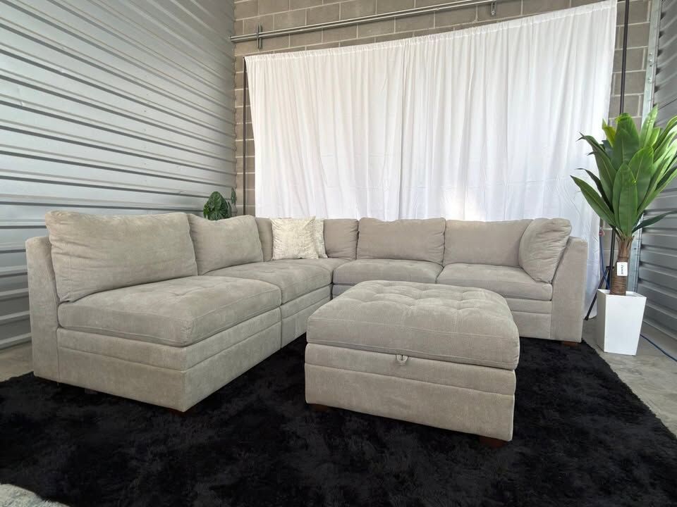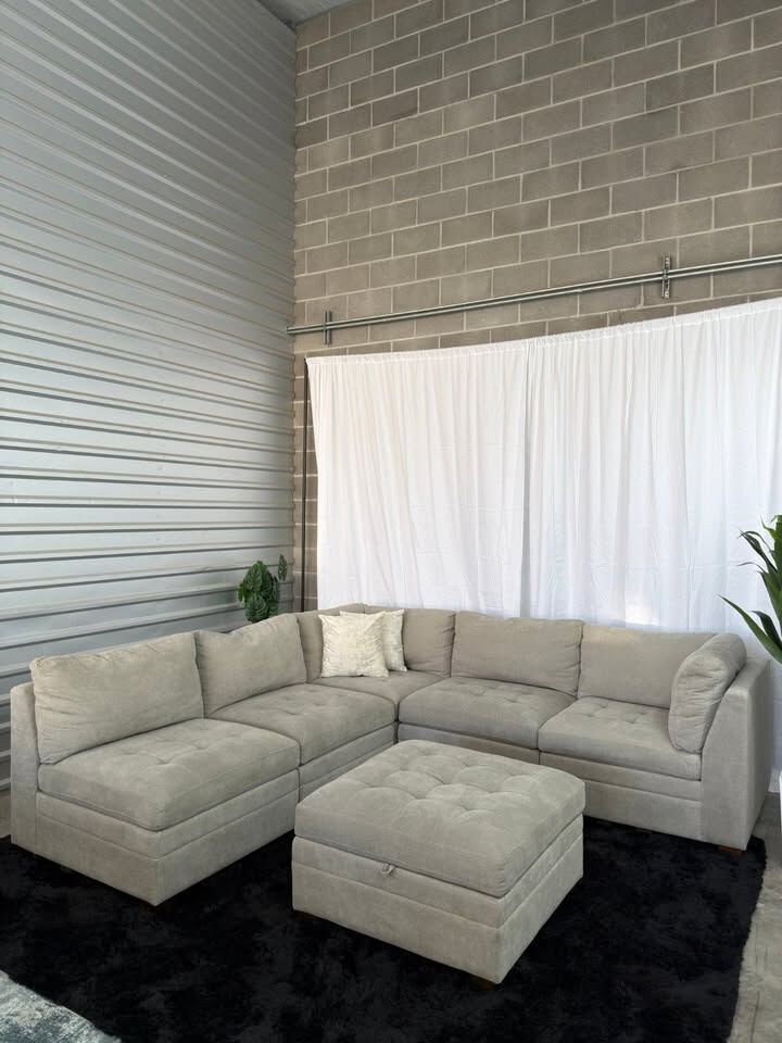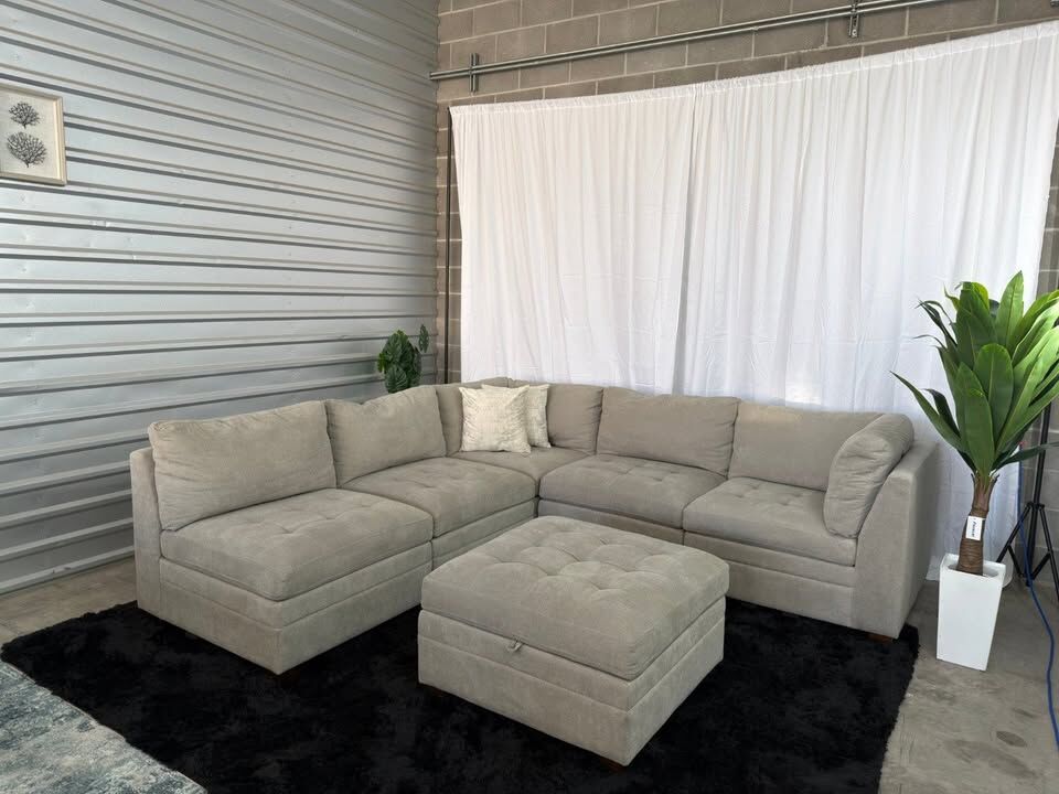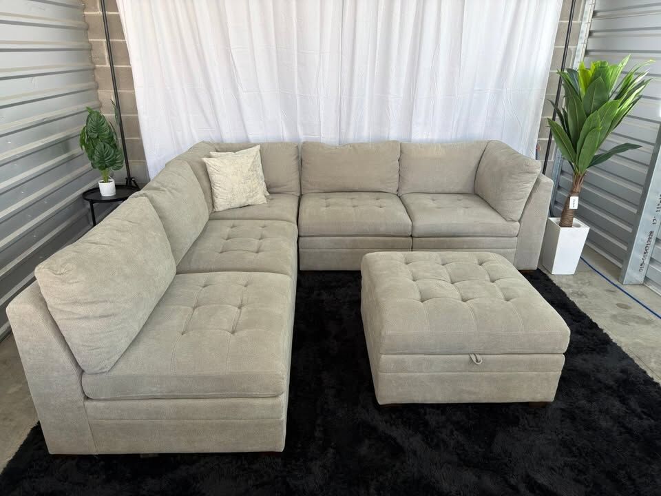 Product Highlights 6-piece modular design – customizable layout Storage ottoman for extra organization Deep seating with comfortable, supportive cushions Neutral beige color – easy to match with any décor