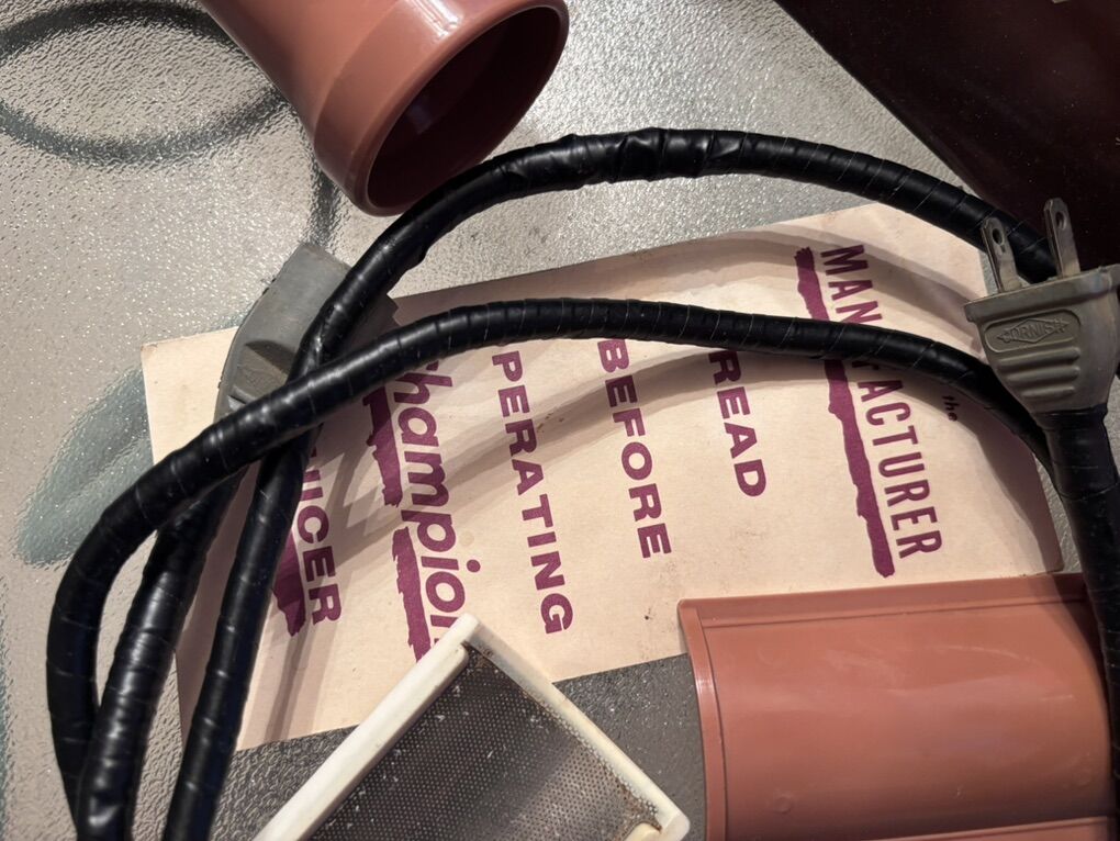 VenmoChampion Juicer World’s Finest Heavy Duty Masticating USA Brown (no funnel). Pick this up last year, not knowing that my former would be returning the one we’ve had during 25 years of marriage. Which is to say, I don’t need two. This one looked virtually unused. It did not come with a funnel. The cord is odd, spun with secondary tape. In perfect working order, though the pieces were so unused that they are tight fitting. Used only a few times for carrot juice, and for a batch of cashew/pecan/almond butter. These machines are indestructible.
