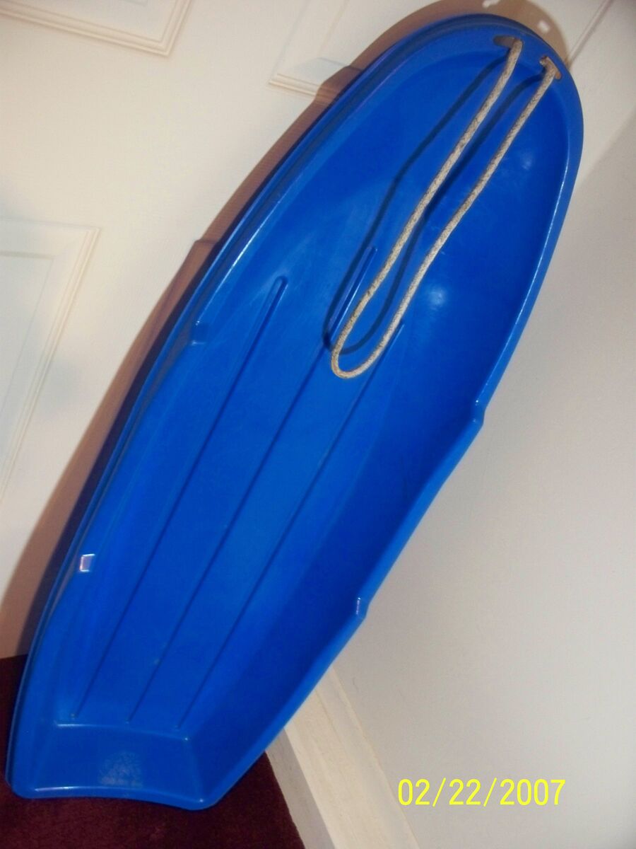 Blue (hard polymer/plastic) snow sled accepts 1 adult or 2 children. 46" X 17". Works well, particularly downhill. Respond by email or phone 801 487-3047. Location: 2800 East near 3300 South
