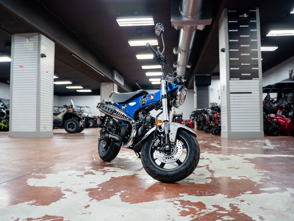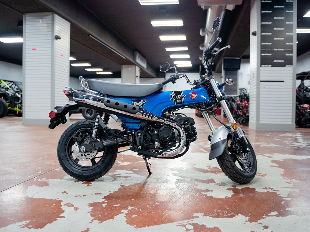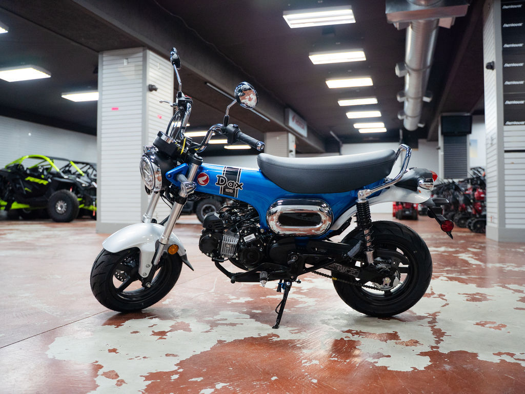 2025 Honda® Dax 125 Off-the-leash fun In the 1970s', the Dax (aka the CT70/Trail 70) was one of our most popular models. And now it’s back, and more fun than ever. That’s thanks to its bigger engine (the same family as in our Grom, Monkey, and Trail125), fuel injection, disc brakes, and electric starting. And with room for two, you can share the fun! Features may include: Upswept exhaust The high exhaust system pays homage to the original trailbike roots, but is super practical too and contributes to the wide powerband. Round LED headlight The round headlight may have a retro look, but it provides excellent visibility and illumination with its updated LED performance. Twin rear shocks Twin rear shocks keep the retro vibe strong. Along with the fat 12-inch tires, they give you a smooth ride too, even over gnarly pavement.