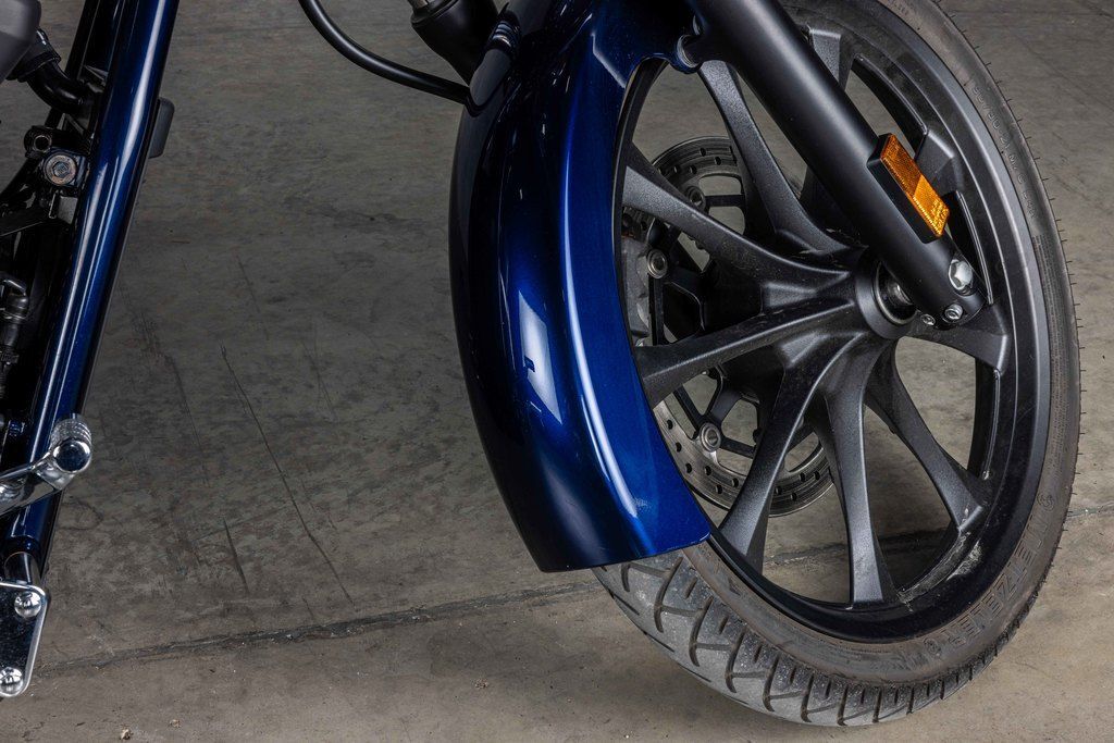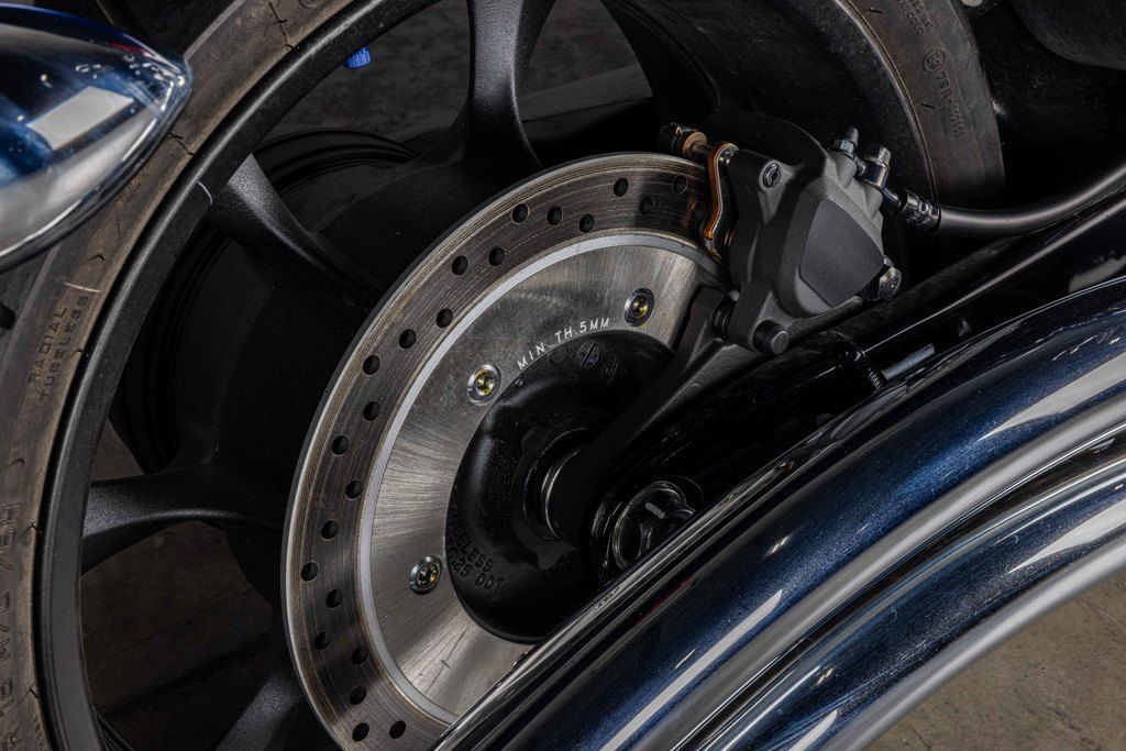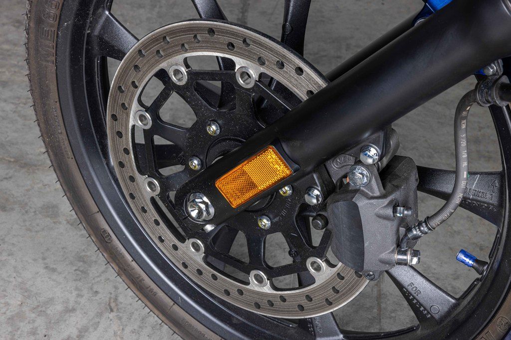 A single, powerful 336mm-diameter front-disc brake is complemented by a 296mm brake disc in back. An ABS version is also available.