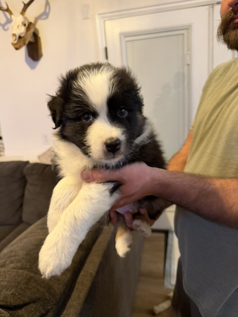 AKC/ASCA Australian shepherd puppies born on Christmas ready to go February 19. 1 male black tri still available. I am honestly shocked he wasn’t the first one to go!