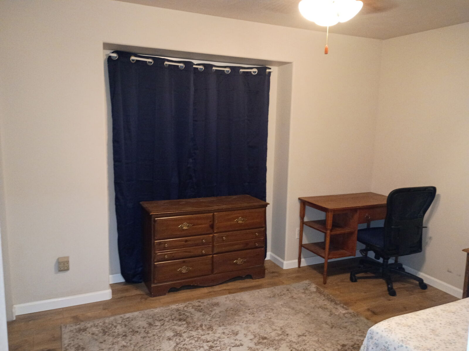 Furnishings available: single bed, dresser, nightstand and drapes.