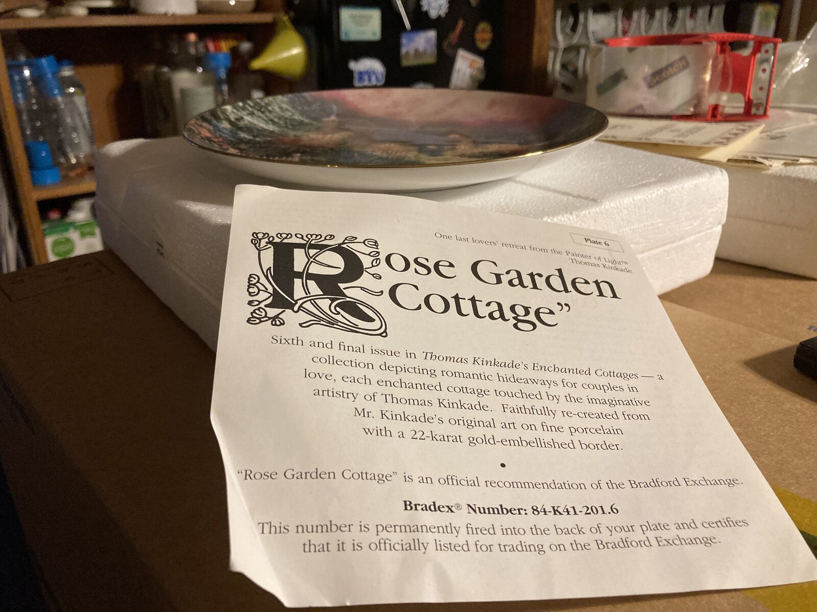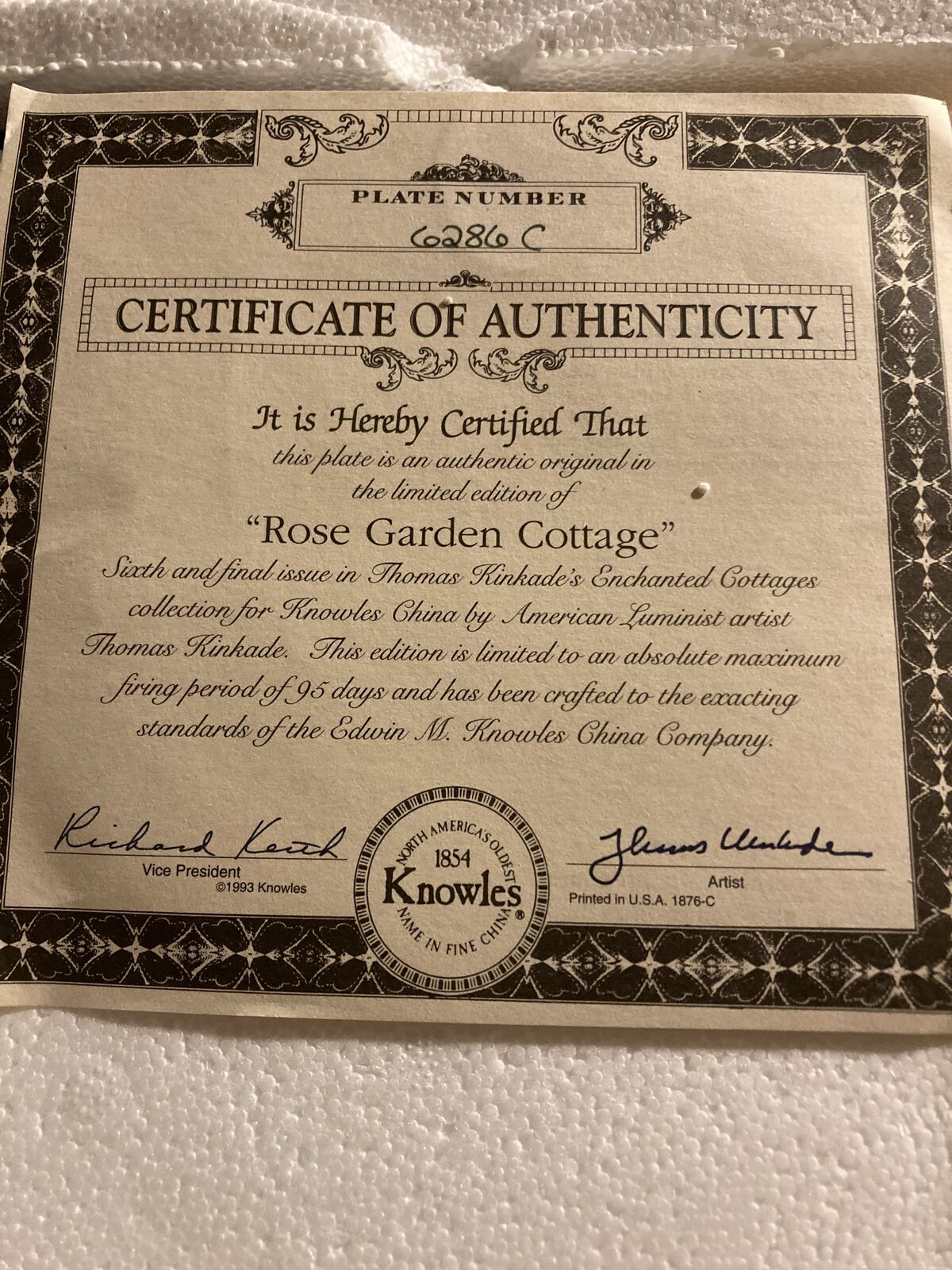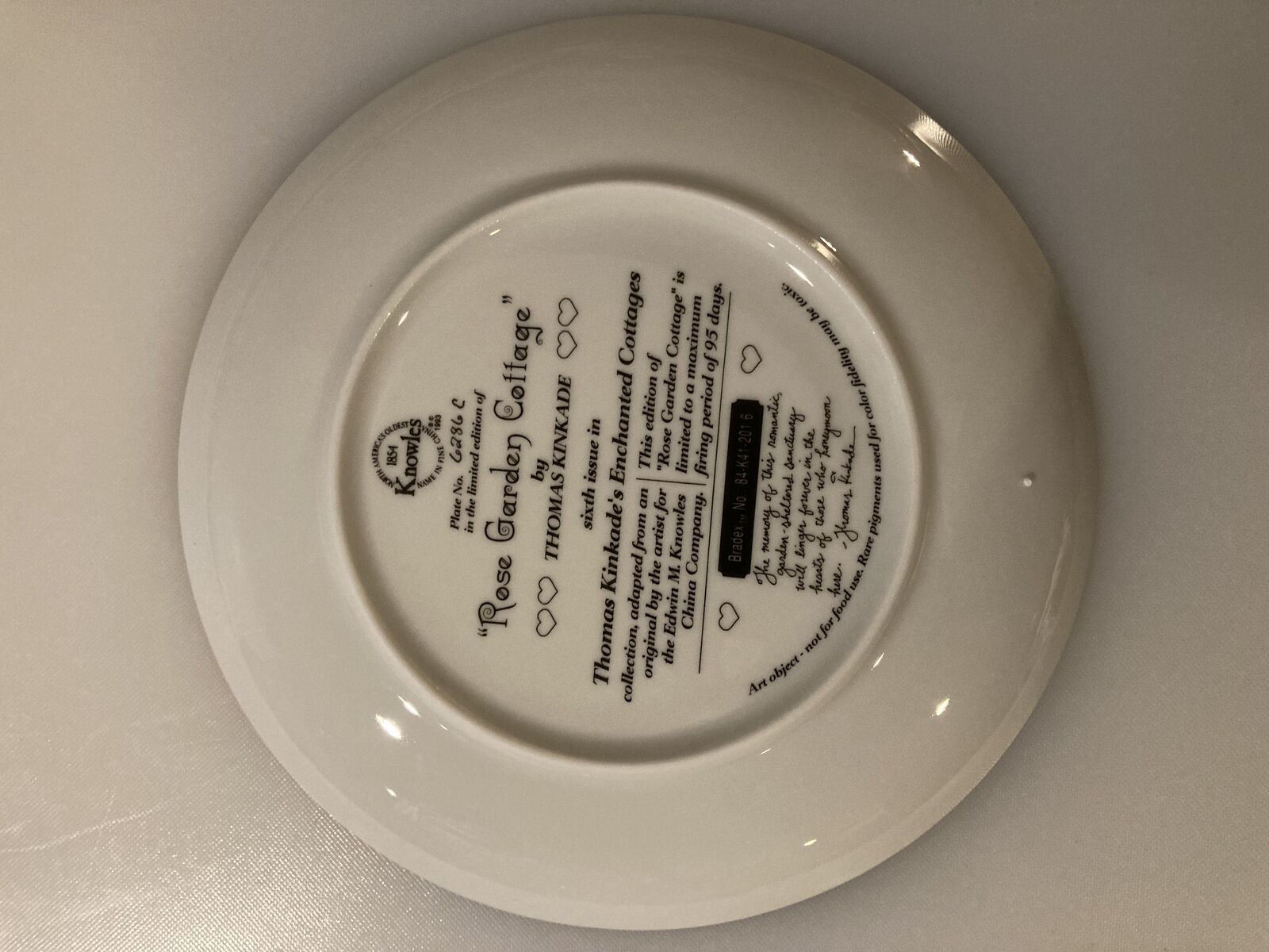 ZelleThis is plate number 6286 C of a limited edition of Thomas Kinkade's "Rose Garden Cottage" as re-created on fine porcelain. "Rose Garden Cottage" is the sixth and final plate in Thomas Kinkade's Enchanted Cottages collection.