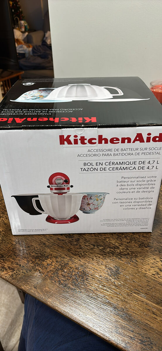 VenmoBrand new KitchenAid 5-qt ceramic bowl for stand mixer. Still in original packaging and unopened. White with a textured design.