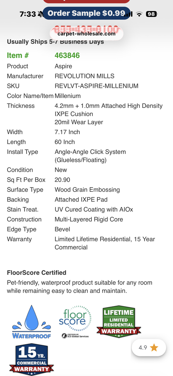 VenmoRevolution Mills - Aspire Millenium waterproof 7"x60" vinyl wood planks. We have 334 sq/ft left over from home flooring project. (16 boxes @20.9 sq/ft ea)