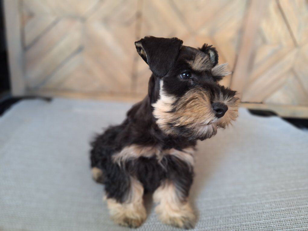 Duke is a charming black and silver colored male Miniature Schnauzer. His estimated adult weight is 11-13 pounds. He has a moderate energy level with an off-switch. Duke is very happy and eager to learn. He is incredibly smart and trainable. Duke loves to play and gets along well with children and other dogs of all ages and sizes. He is wonderful to travel with, loves the agility course, and is an all around stellar guy!