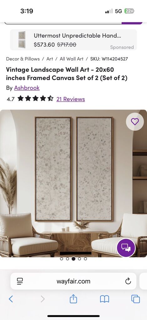 Set of 2 large framed floral wall art canvas. 60”x20”. Retail price is $229 from Wayfair.